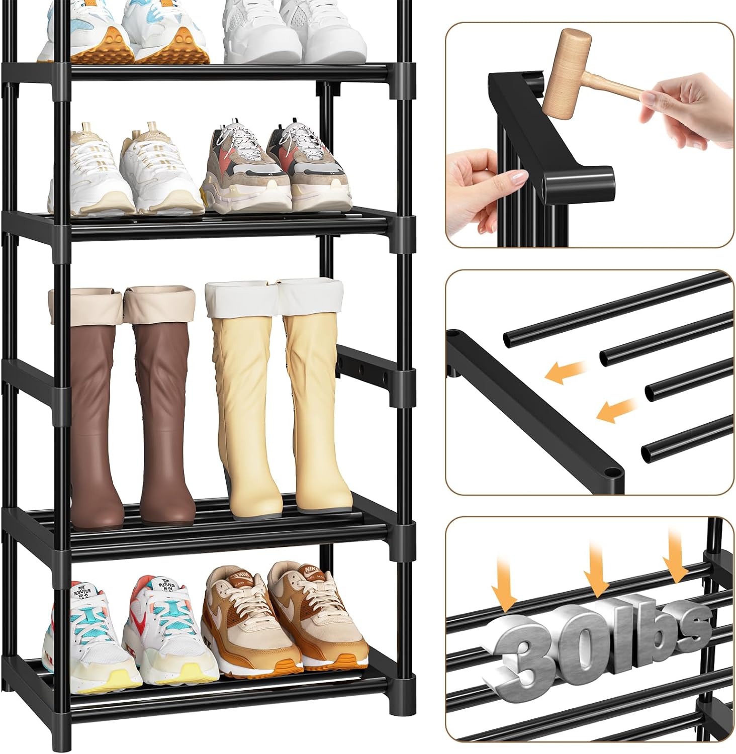 2-Sturdy Shoe Rack: The shoe rack is made of sturdy metal tubing, high quality reinforced plastic connectors for stability and rust resistance. Each tier can support up to 30 pounds, its has good stability and weight capacity to support even the heaviest shoes.