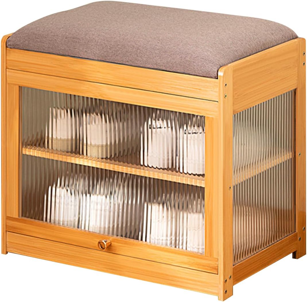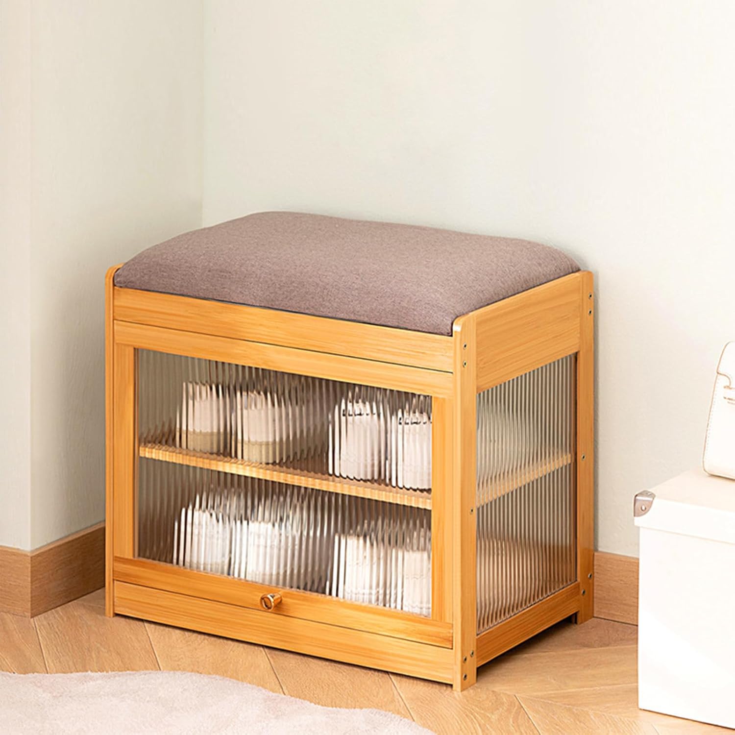Shoe Storage Bench- Bamboo Entryway Bench with Seat Cushion, 2-Tier Shoe Rack with Removable Dividers and Hidden Storage Space, Organizer Ottoman for Bedroom, Mud Room, Patio, Natural-Small