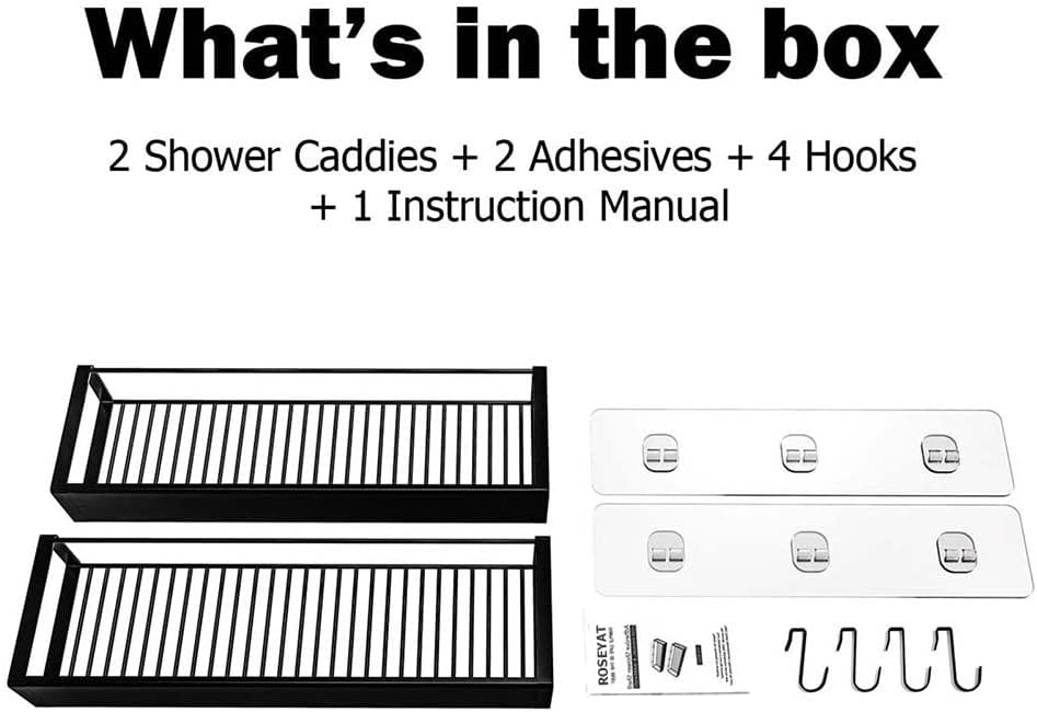 【Package Include】12.2 x 4.3 x 2.2 inches shelf with a detachable front plate, 2 versatile caddies, and 4 removable hooks for razors, towels, sponges, washing clothes, etc. Contact us if you need more strong adhesives to remove the caddy to other places, or search the ASIN: B097Y57BLL to find it