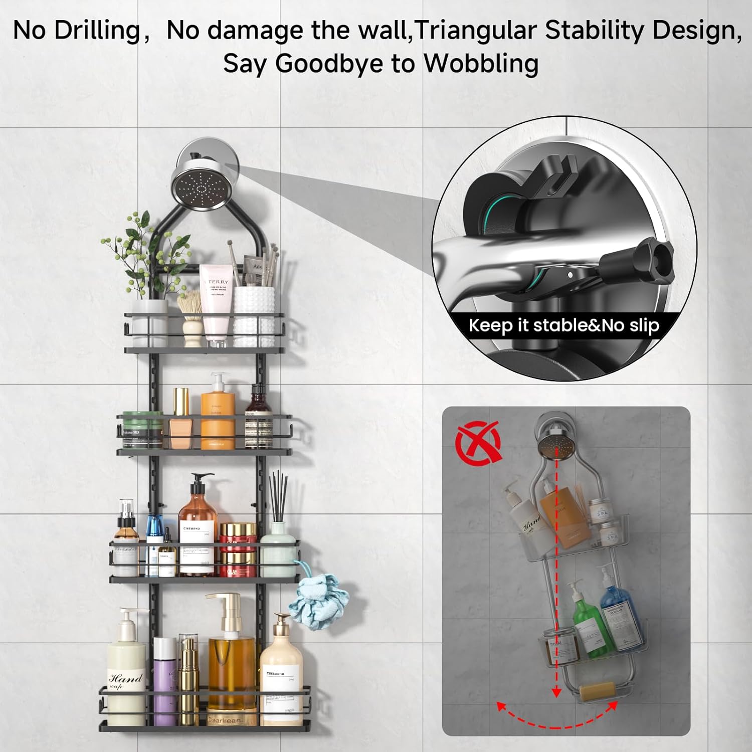 Height Adjustable & Load Max 40 lbs: The shower shelves hanging features a design to fit items of varying heights, Free to adjust the distance between each baskets, including taller shampoo bottles and lotion and conditioner each basket holds up to 10 lbs. The over shower head caddy holds up to 40 lbs of toiletries