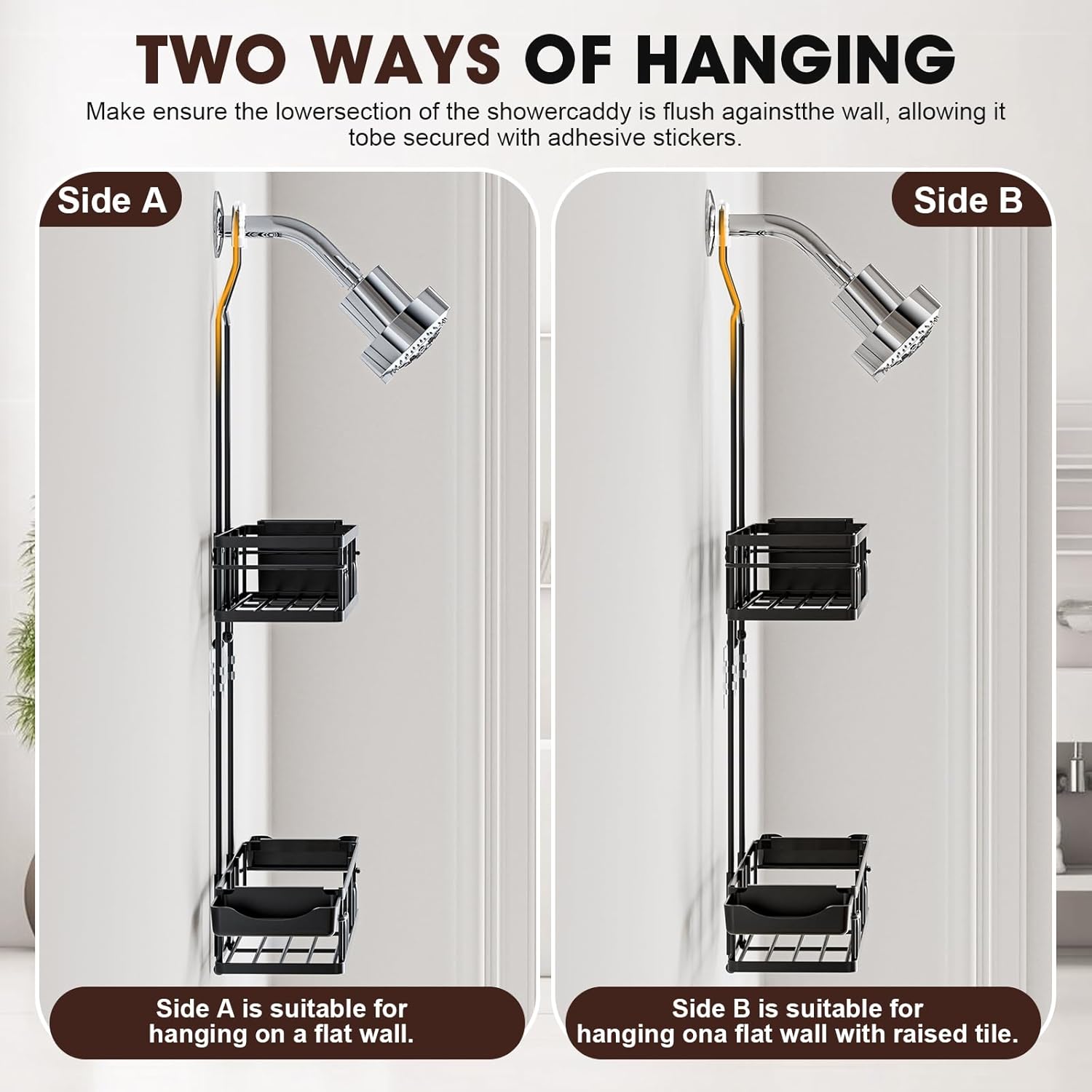 Easy Installation with No Drilling: To install our bathroom storage shelf, no drill and no hardware. You just need to insert the lower part into the upper pipe of the shower rack, then screw on the screws, hang two baskets, place the shower shelf above the shower, then fix the suctions, and you are done, you can enjoy your cozy bathroom relaxation time.