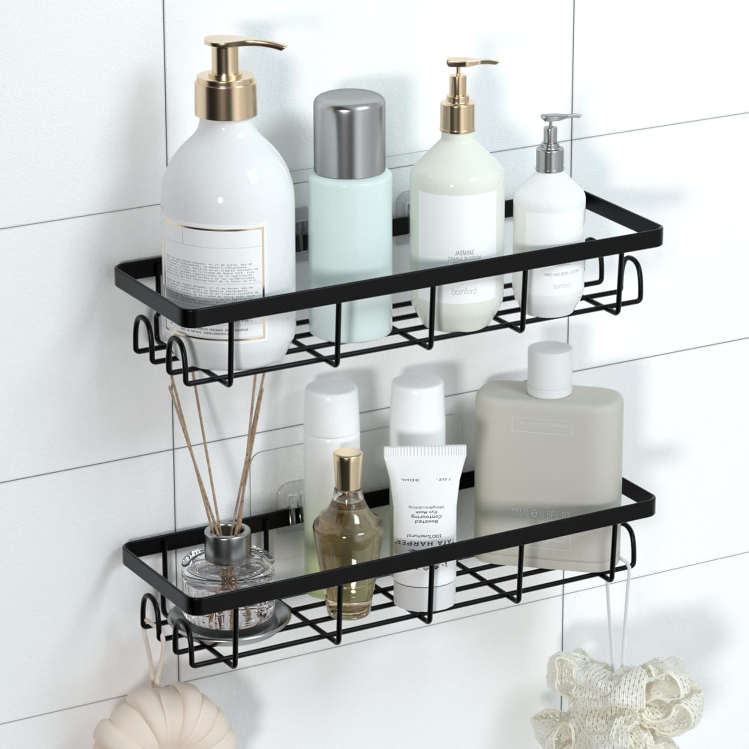 Shower Caddy Organizer with Hooks,Self Adhesive Bathroom Shelves,No Drilling Bathroom Organizers and Storage,Perfect for RV, Apartment, Home Decor,2 Pack Black