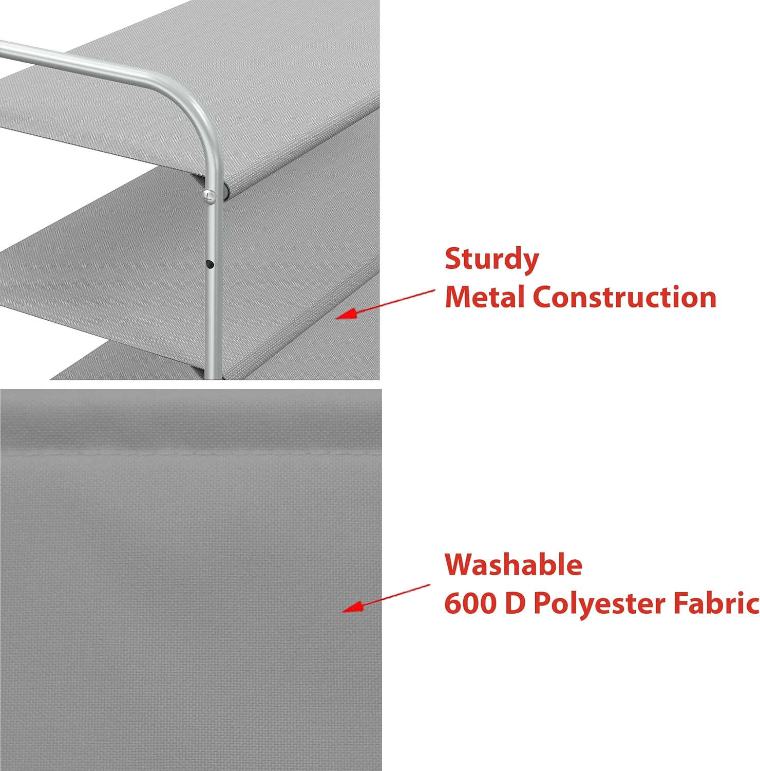 Sturdy metal construction with washable 600 D polyester fabric, each shelf holding up to 30 lbs.