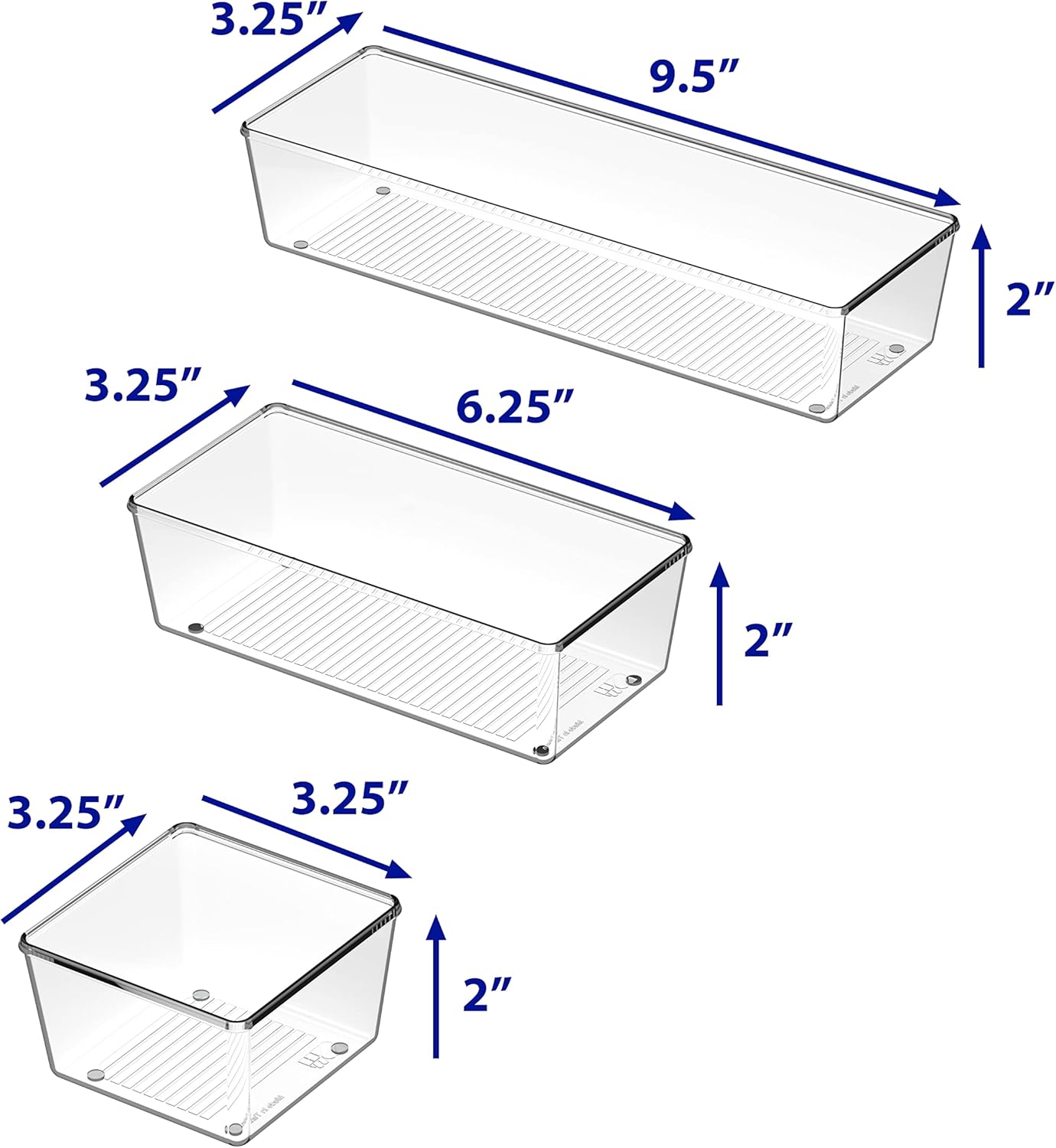 Great for makeup vanity drawers, bathroom drawers, office and craft drawers….etc.Dimensions: 2pcs-3.25″x3.25″x2.25″, 2pcs-6.12″x3.25″x2.25″, 2pcs-9.75″x3.25″x2.25″