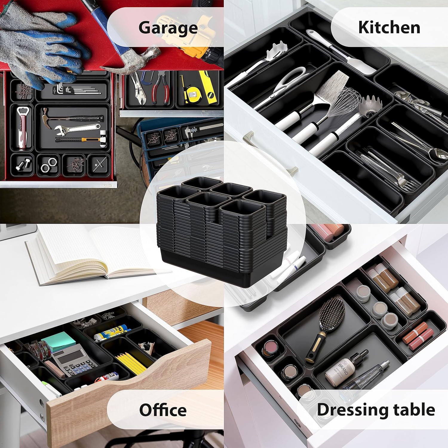 Different size bins to create customized combinationGreat for makeup vanity drawers, bathroom drawers, office, garage and craft drawers