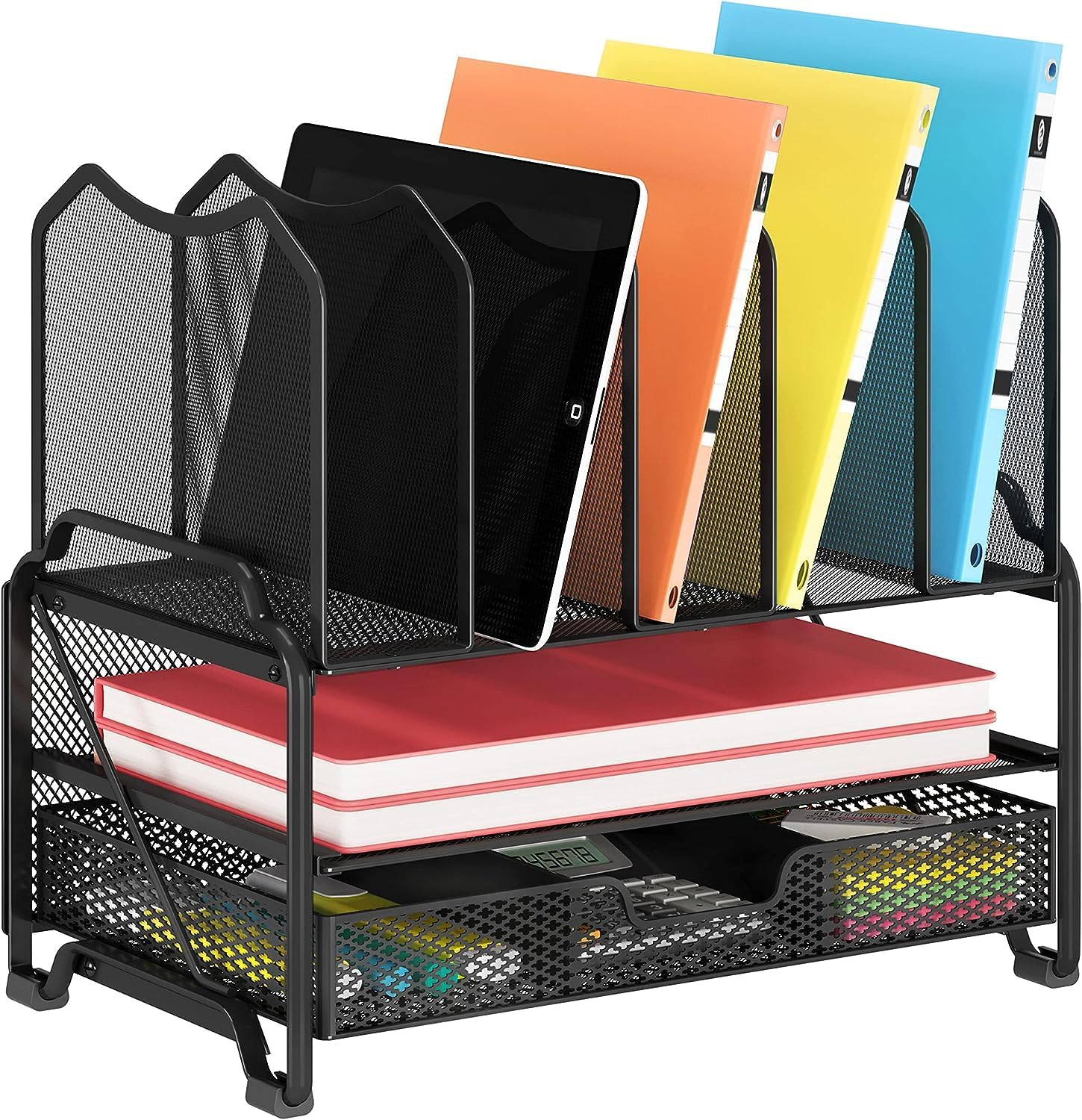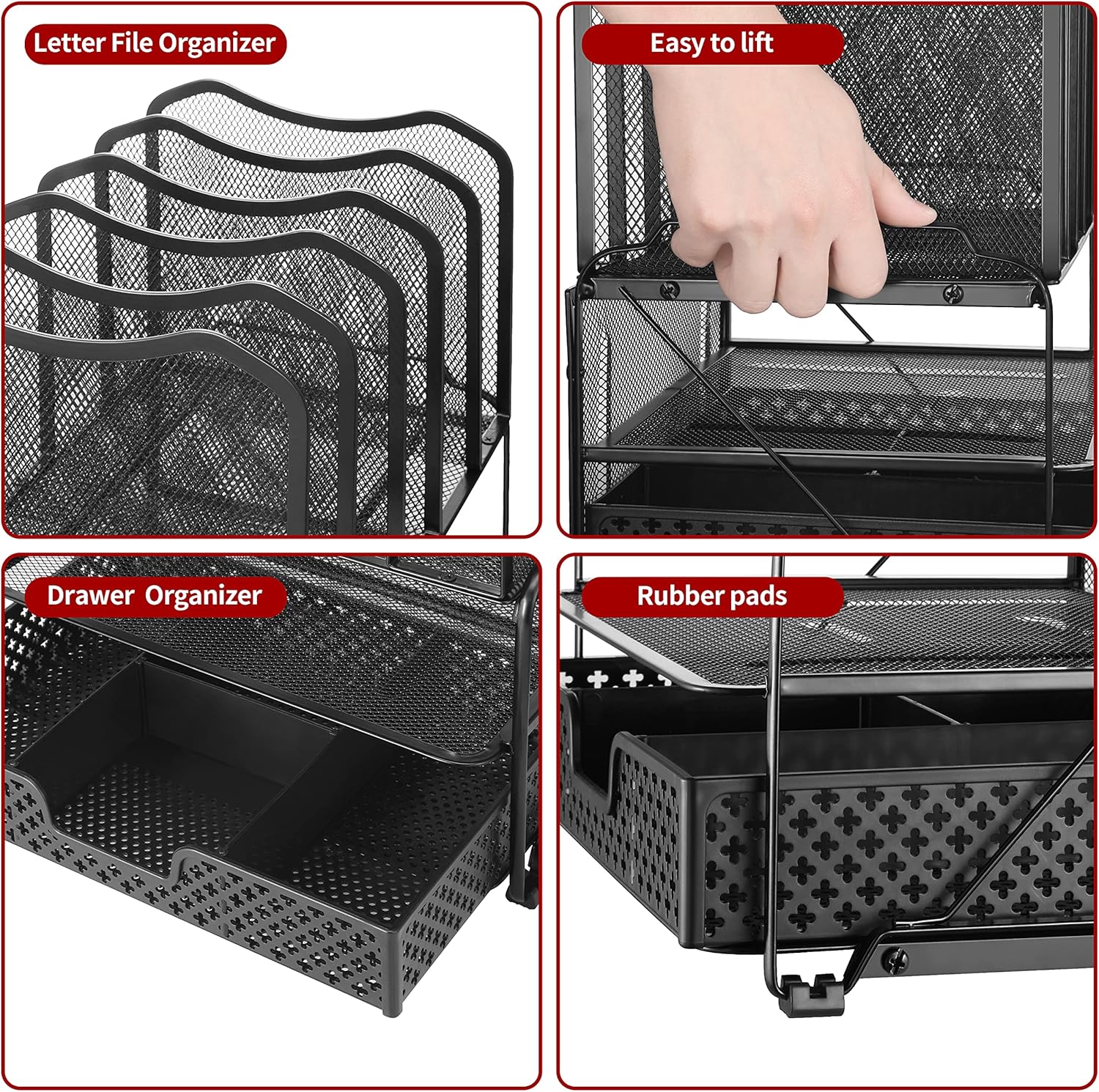 Simple Trending Mesh Desk File Organizer, Office Supplies Desktop Storage with Sliding Drawer, Double Tray and 5 Upright Section Sorter Organizer, Black