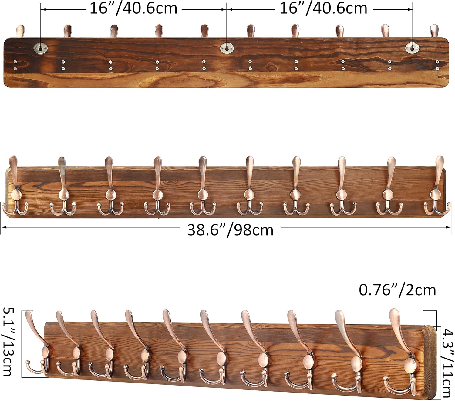 【Already Assembled Wall Coat Rack】 The aluminum alloy hook has been screwed on the solid wood base. SIZE: SIZE: 38.6 (L) x 4.3 (W) x 0.76 (Thick) inches.