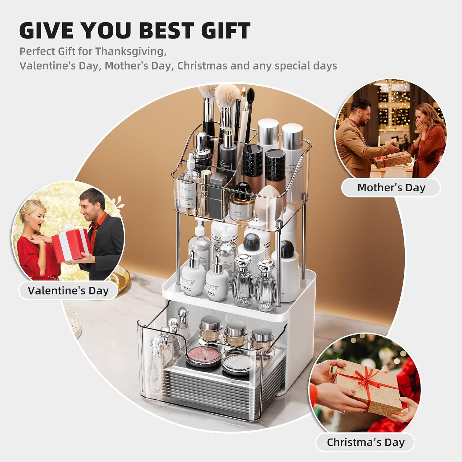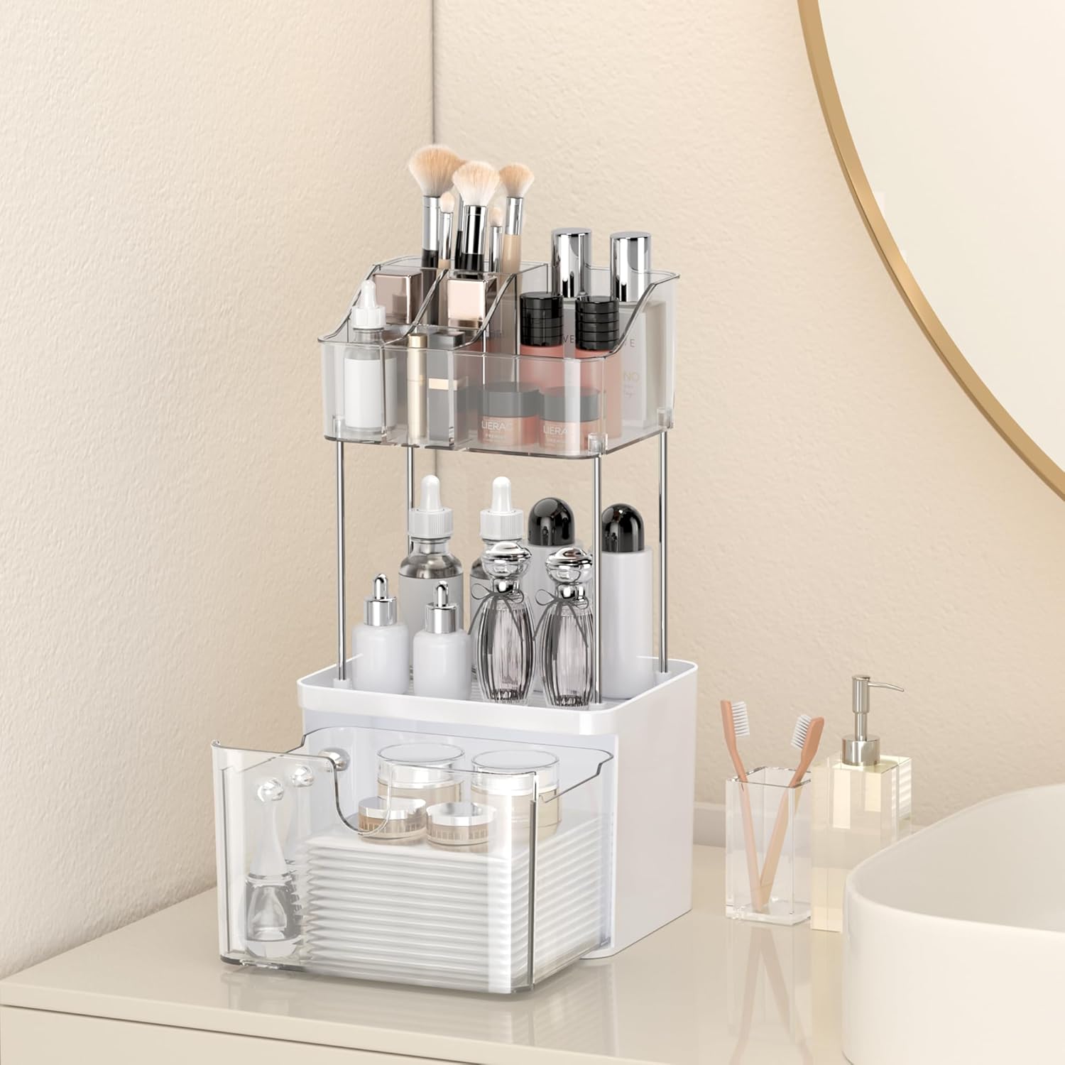 PERFECT BATHROOM/VANITY COUNTER ORGANIZER: With bottom layer drawer, the middle area is open and is easy access for your bottles. The top layer is divided and is great to organize eyelash glue, eye pencils, brushes, lipstick, that can be stored there and puts everything in order.
