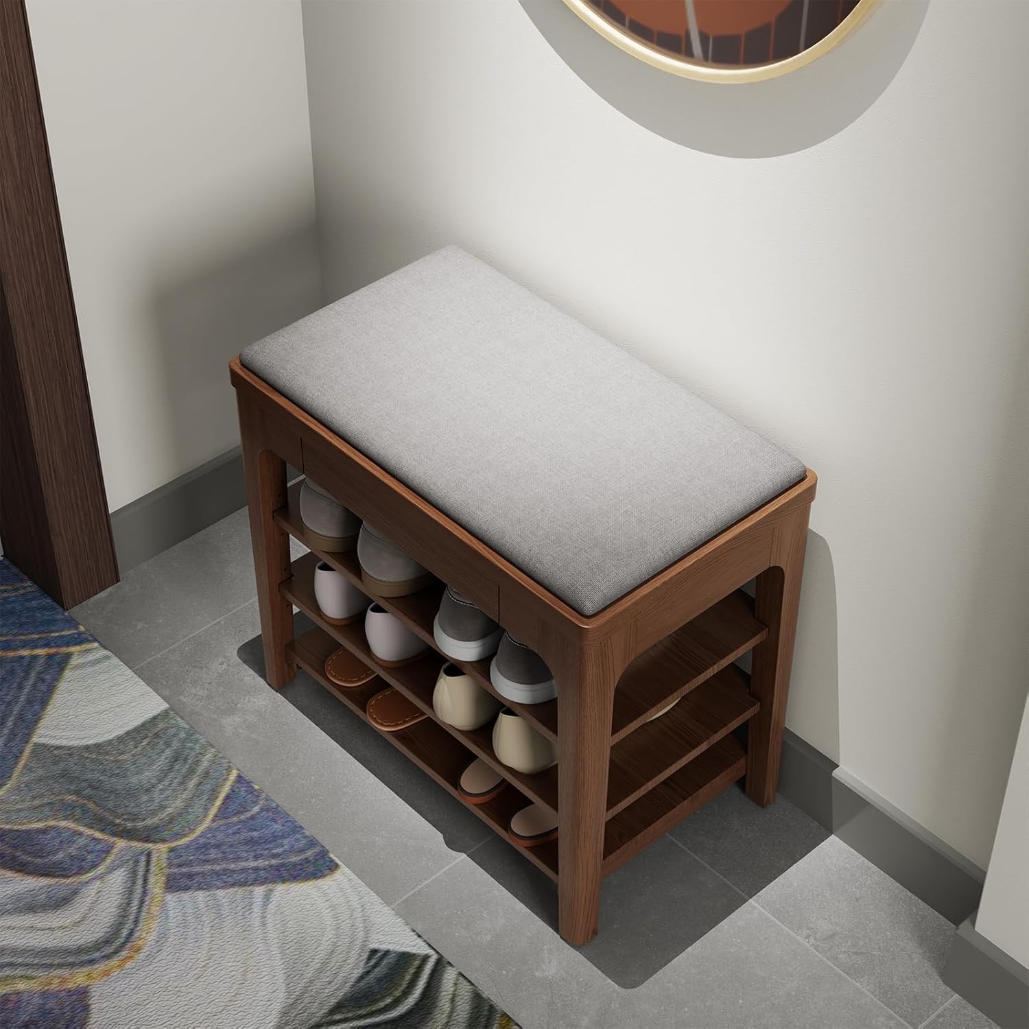 Small Shoe Bench with Storage, Wooden Shoe Storage Bench with Cushion&Hidden Drawer, 3-Tier Shoe Rack Bench for Entryway, Mudroom, Hallway