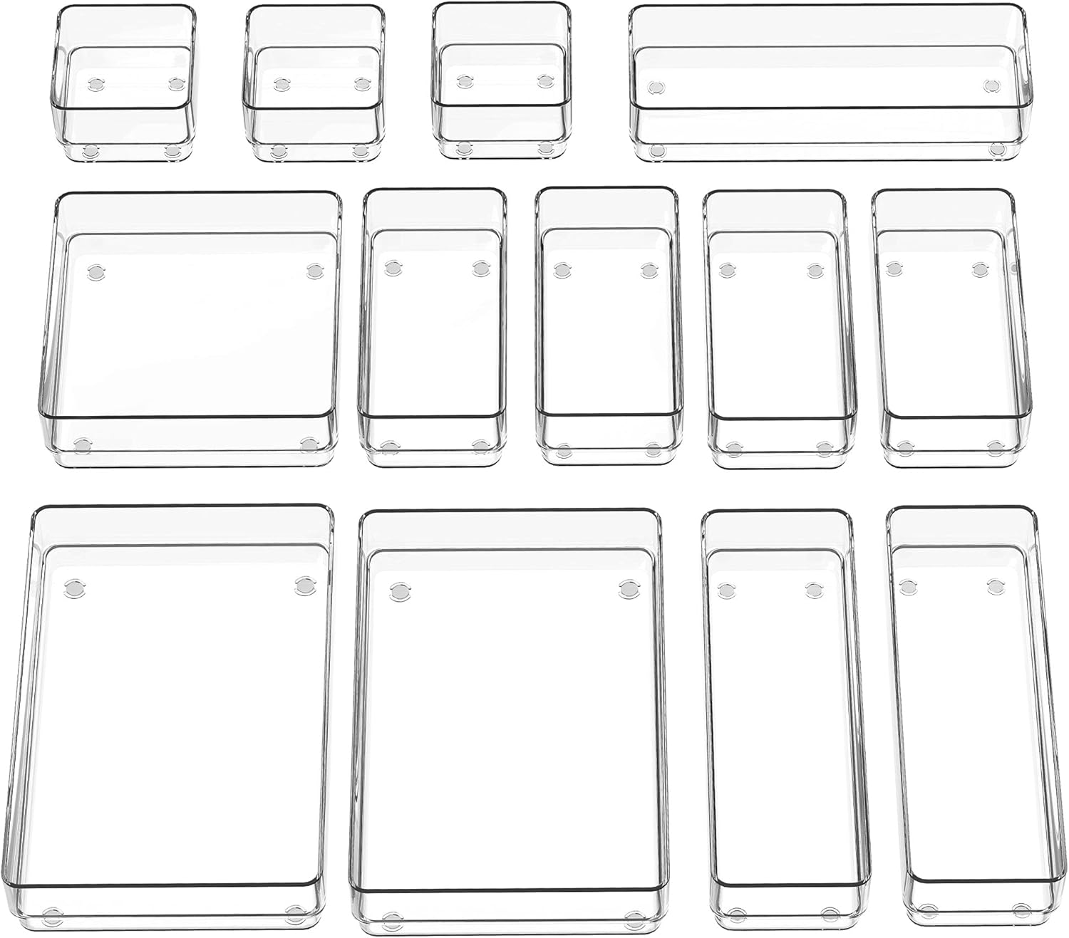 Multiple Sizes – 5 different sizes and 13 pieces trays offer you customize combinations to store stuff and organize drawer for your specific needs. Size: 8.9 x 5.9 x 1.9 inches (2 pack), 8.9 x 3.0 x 1.9 inches(3 pack), 5.9 x 5.9 x 1.9 inches(1 pack), 5.9 x 3.0 x 1.9 inches(4 pack), 3.0 x 3.0 x 1.9 inches(3 pack).