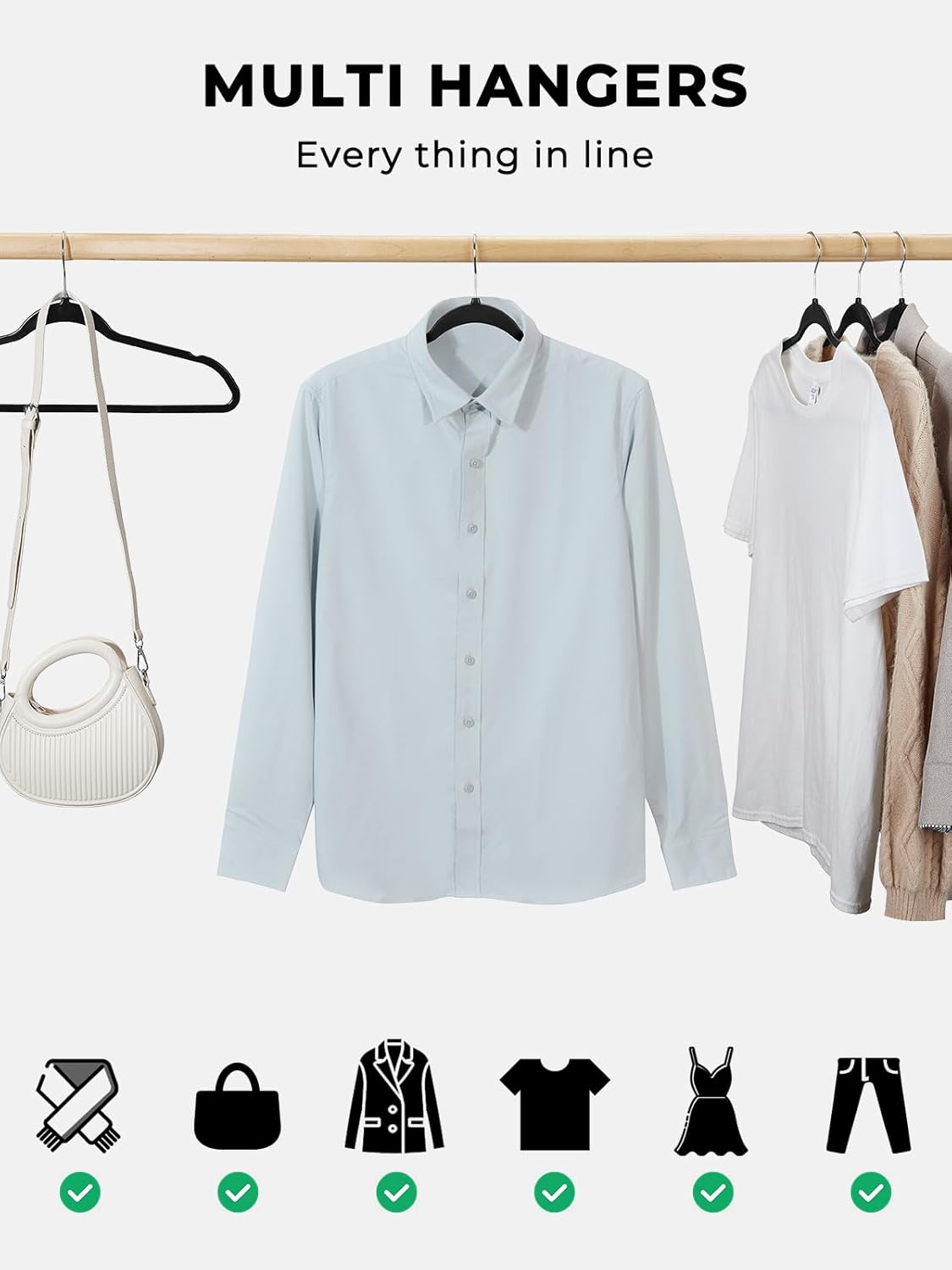 Space-saving for Storage – Maximize Your Closet Space with these slim hangers! Measuring the same thickness as flocked hangers, our thin hangers are great for small closets, freeing up valuable space for more clothes and accessories.Hangers space saving for everywhere could be a great solutions for storage of closet, organizing any corner for extra season clothes changing