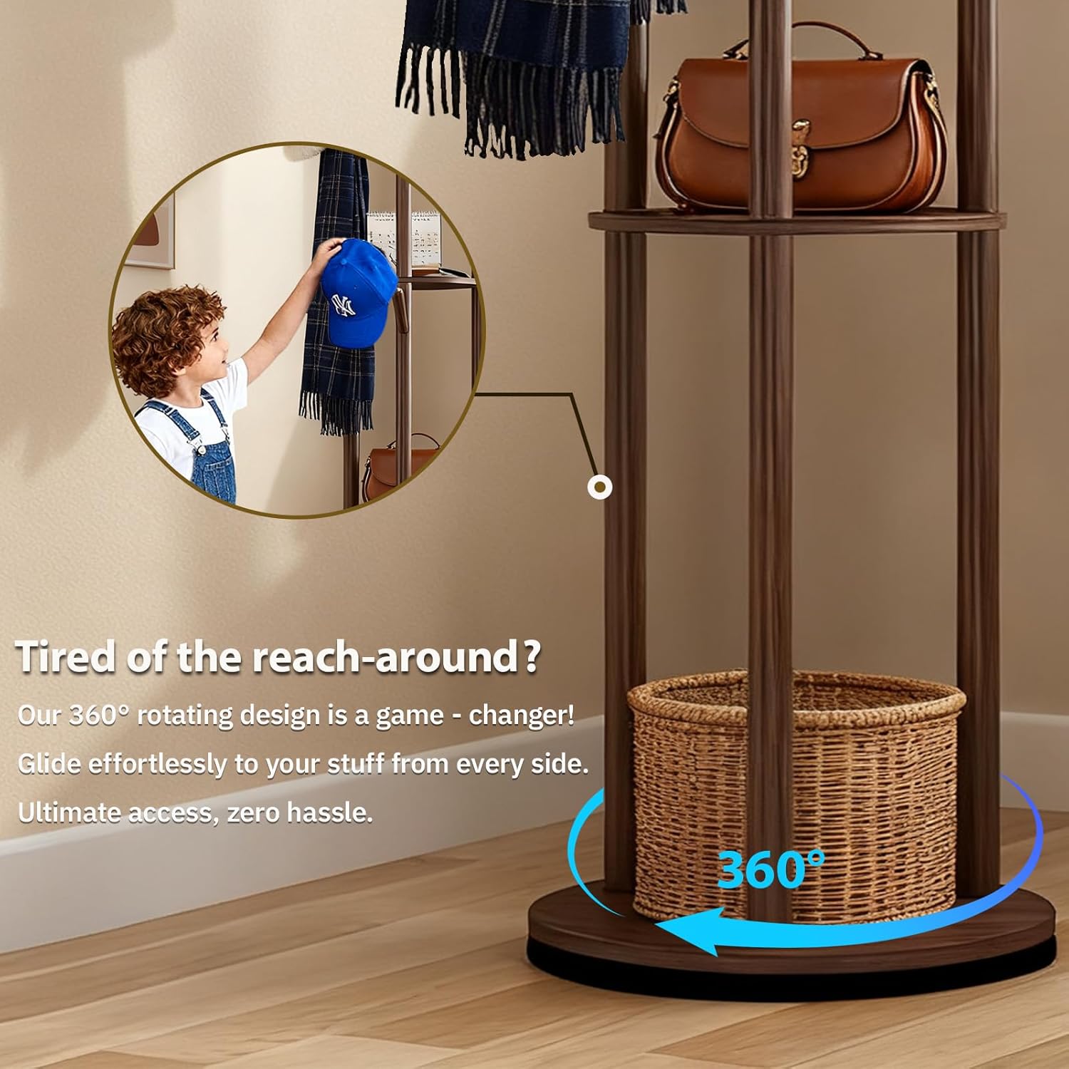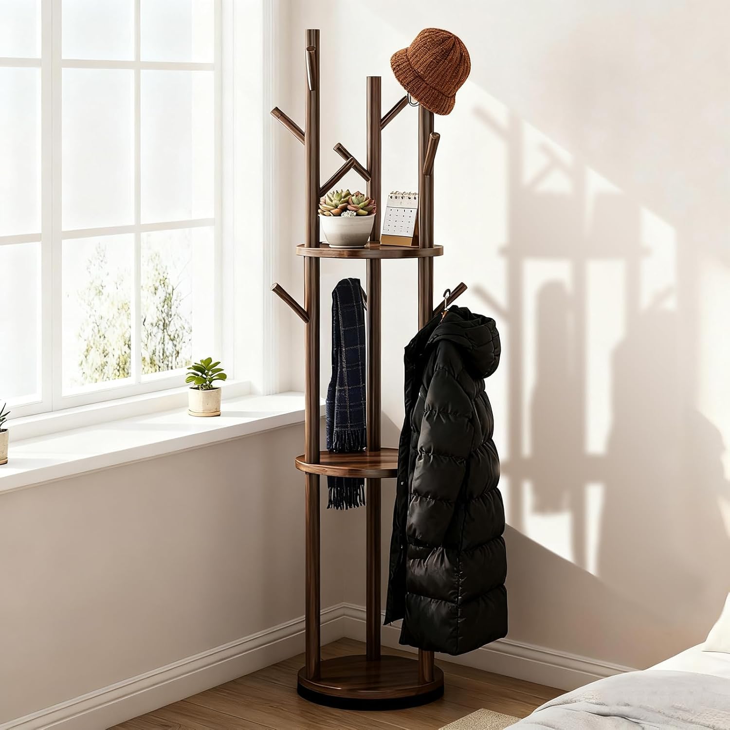 Solid Wood Coat Rack, Rotary Freestanding with 3 Shelves and 9 Hooks Coat Tree, Heavy Duty Coat Stand for Hats, Bags, Coats, for Entryway, Hallway, Bedroom, Office, Walnut