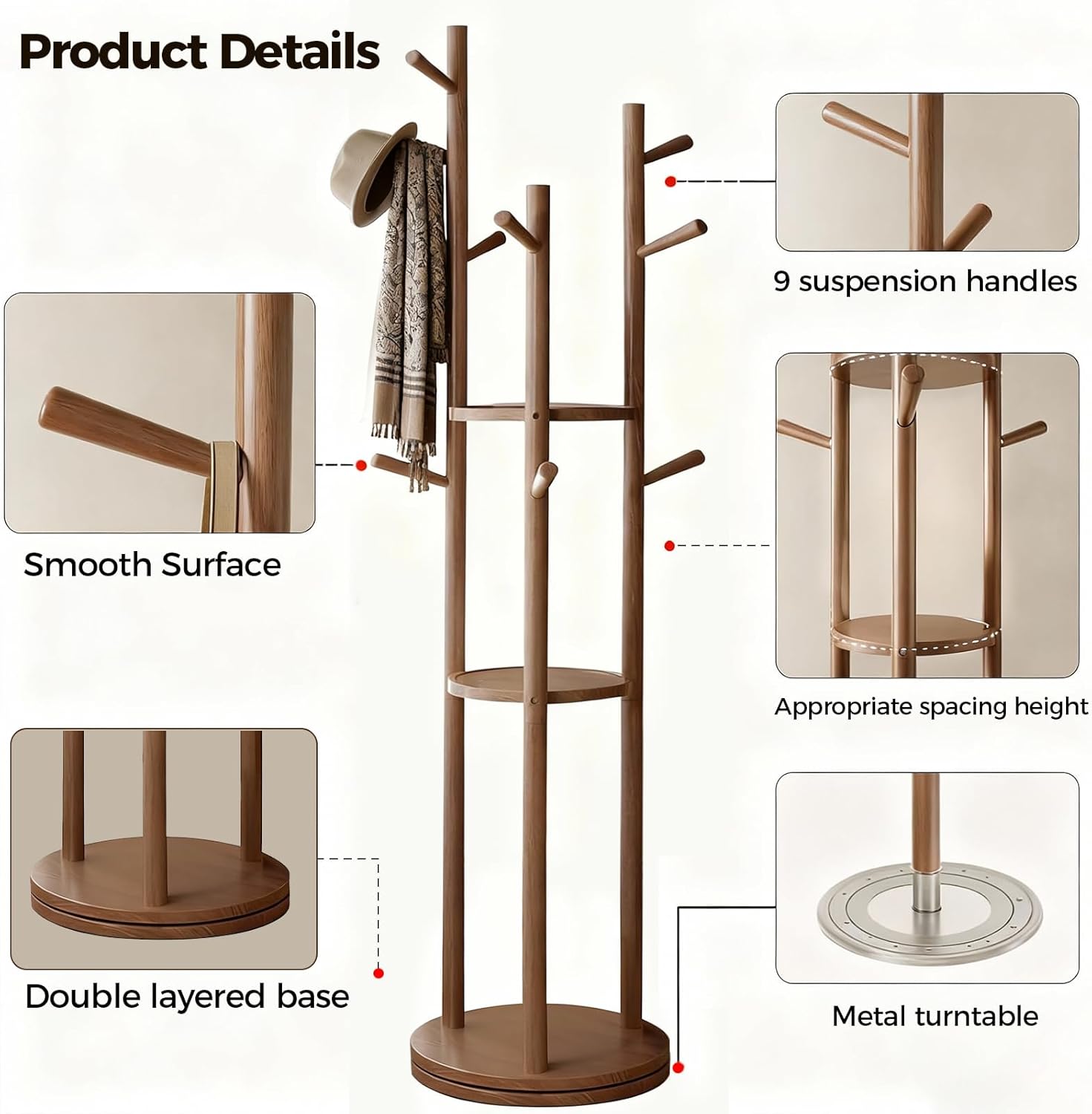 Solid Wood Rotary Coat Rack with 3 Shelves and 9 Hooks, Freestanding Coat Rack,Coat Hanger Stand for Bedroom, Entryway, Livingroom,