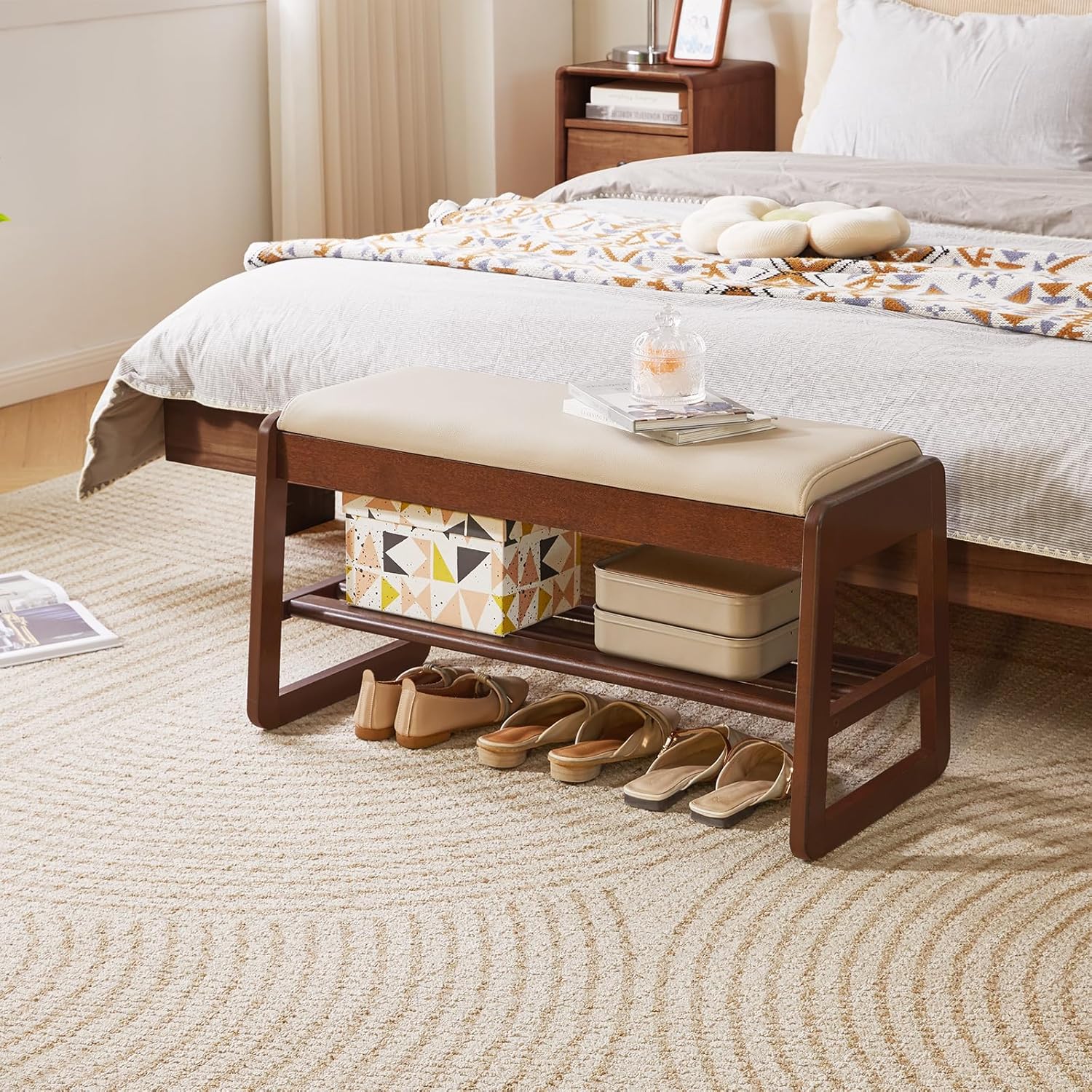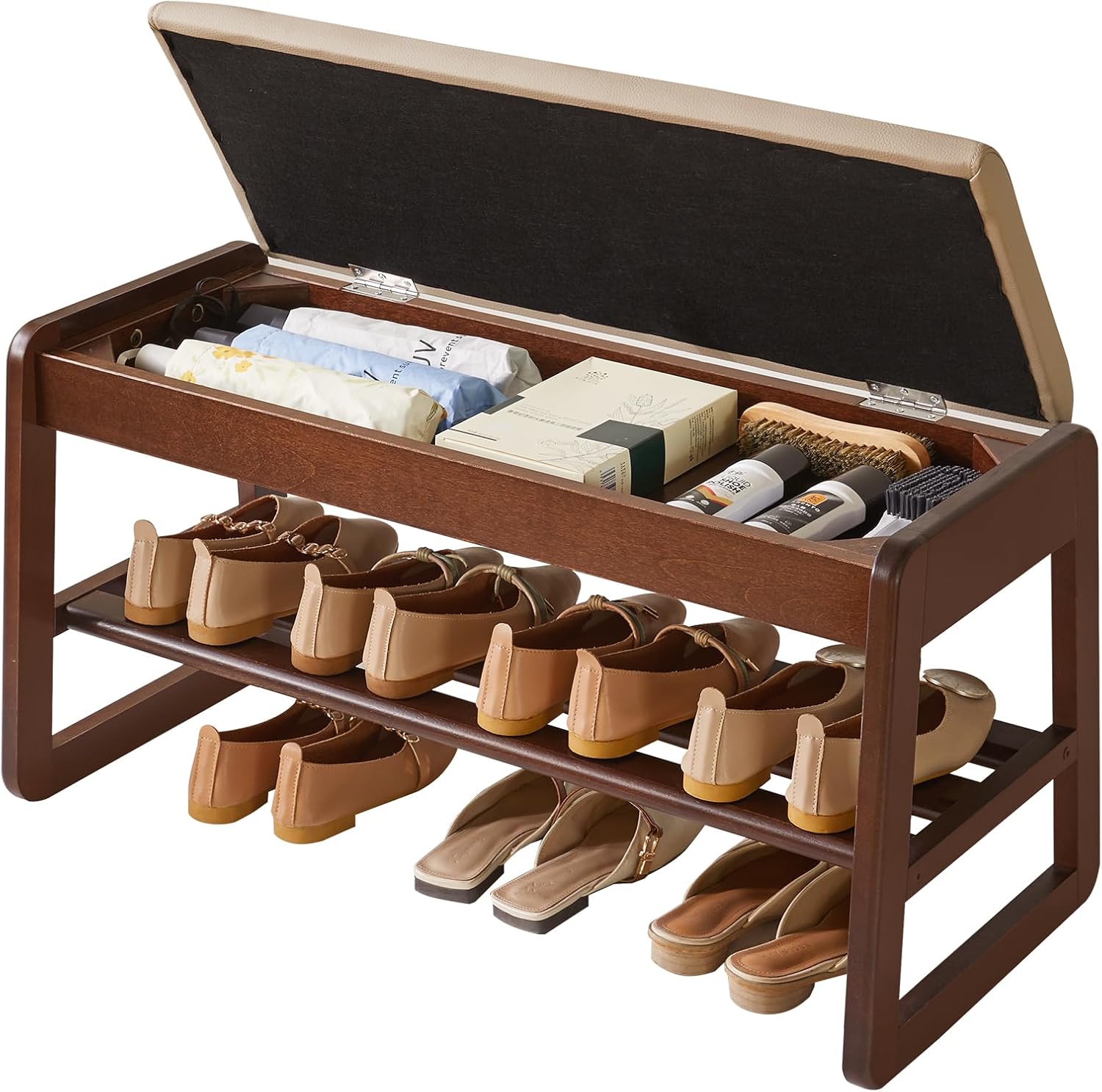 Solid Wood Shoe Bench with Cushion, 2 Tiers Wood Shoe Bench with Flip-Top Storage, 31.5in Shoe Rack for Entryway, Hallway, Walnut Color YD-WD061B