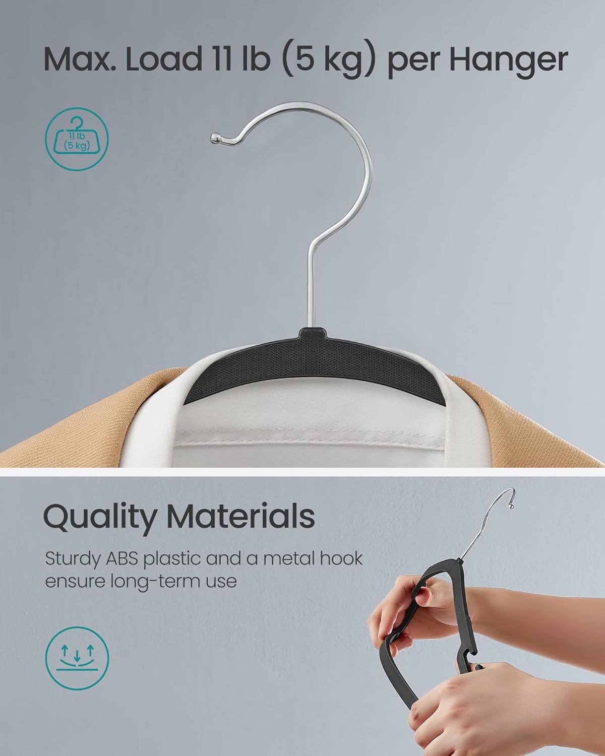 【STRONG SUPPORT】Made from premium ABS plastic and a metal hook, each coat hanger can support up to 11 lb (5 kg). Feel confident hanging heavy coats and winter clothes without worrying about the hangers breaking