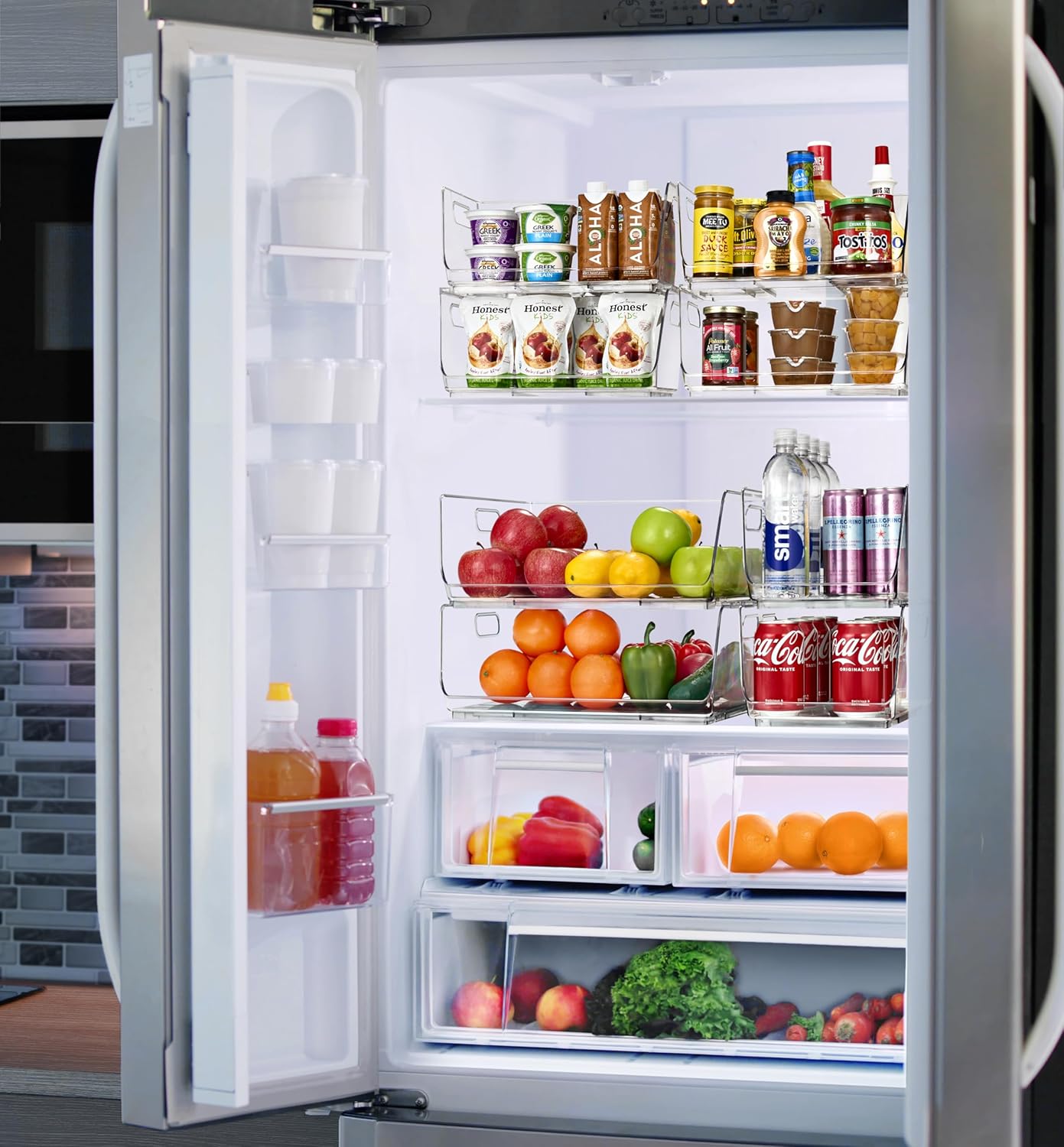 Versatile Use: Great for storing fruits, veggies, packaged goods, yogurts, canned goods, drink boxes, baby food, condiments, cleaning supplies, bath products, makeup, and more. Versatile use as clear open front storage bins, stackable food storage bins, stackable kitchen storage, clear plastic bins for pantry, stackable cabinet storage bins, stackable bins for pantry, open bin storage basket, and stackable pantry bins