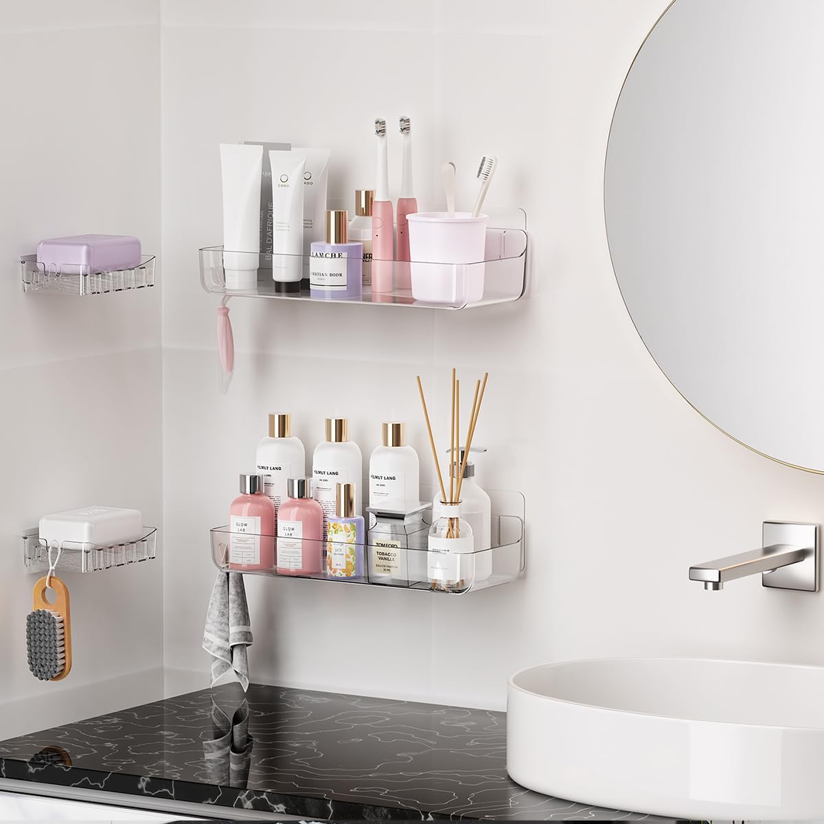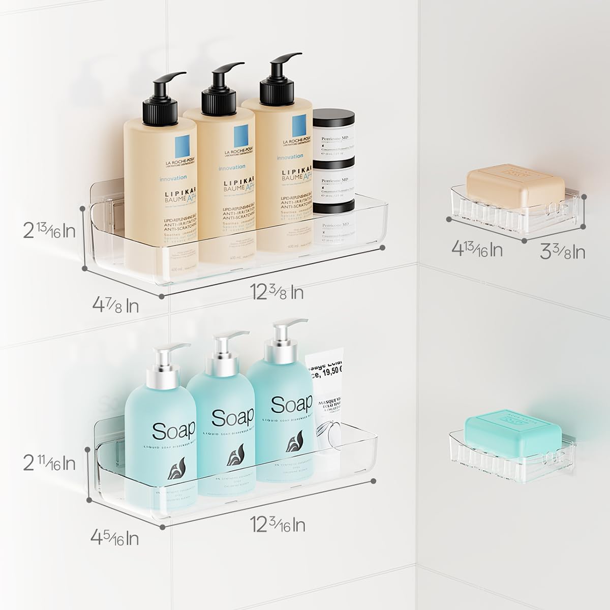 Sotfamily Clear Shower Caddy, Acrylic Wall Mounted Shower Shelves with Soap Dish & Adhesive Pads for Bathroom Organizers and Storage, No Drill Shower Caddies for Bathroom Decor