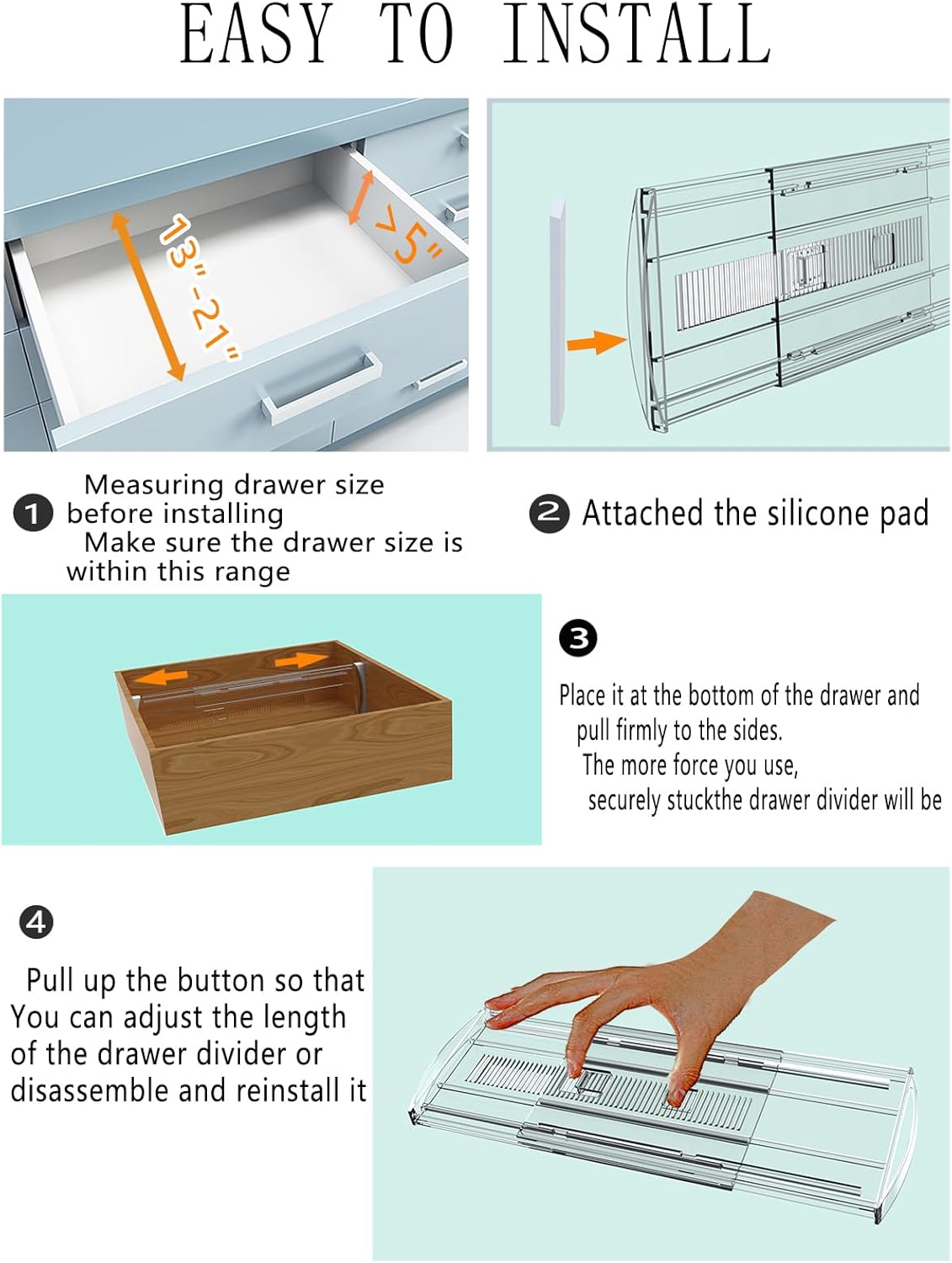 2:Easy to Use–1: Attached the silicone pad(Protect drawers from damage) 2:Place it at the bottom of the drawer and pull it forcefully on both sides. The harder you apply, Drawer Dividers Organizer the more firmly stand.
