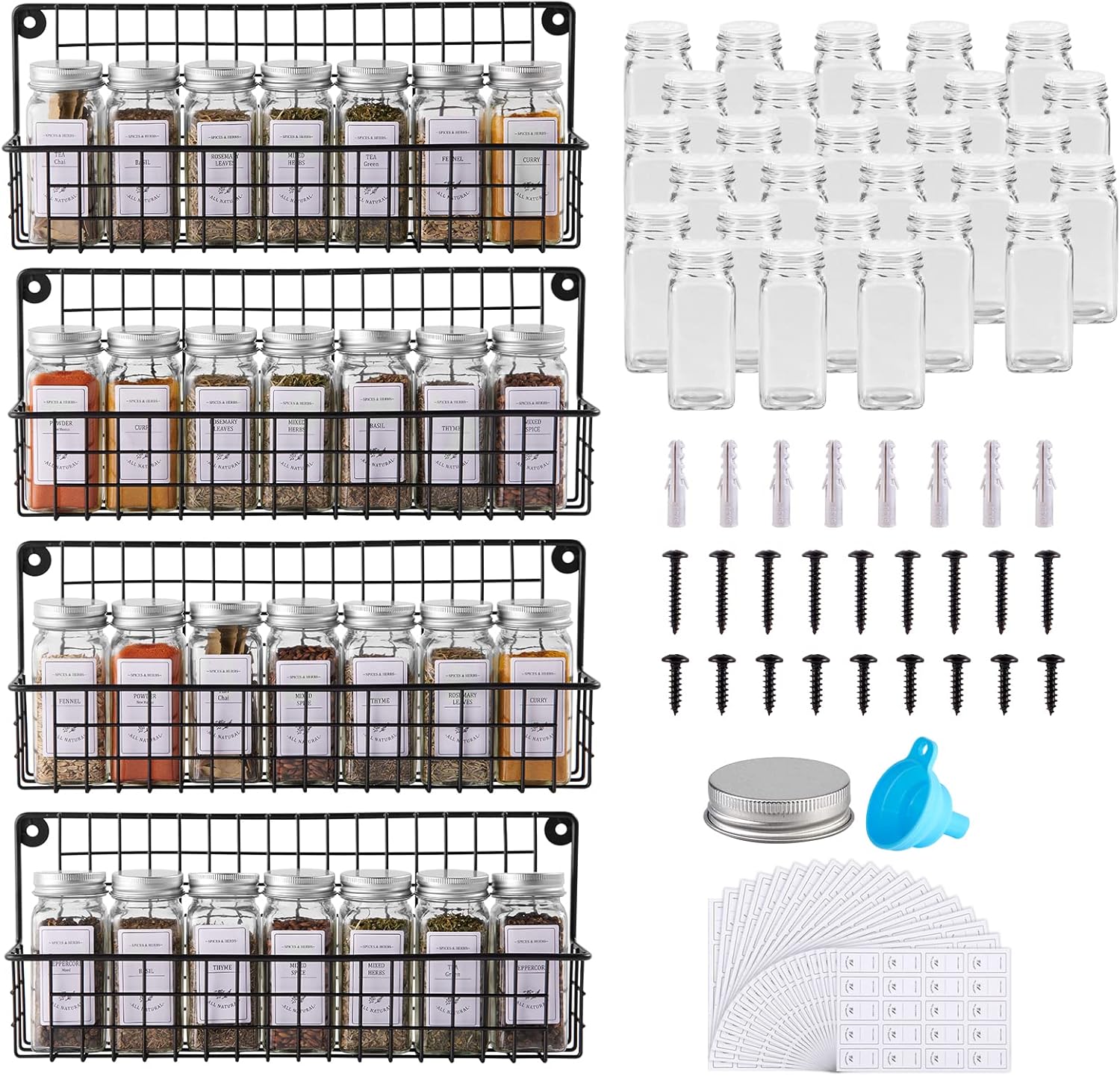 🏈【𝙨𝙥𝙞𝙘𝙚 𝙧𝙖𝙘𝙠𝙨 𝙬𝙞𝙩𝙝 𝟮𝟴 𝙅𝙖𝙧𝙨 𝙖𝙣𝙙 𝟰𝟬𝟬 𝙡𝙖𝙗𝙚𝙡𝙨】:Our hanging spice rack for wall complete set includes 4 durable black wire metal racks, 28 classic 4oz glass jars, 400 elegant white labels, 1 collapsible silicone funnel, plus 4 packs of necessary mounting screws.