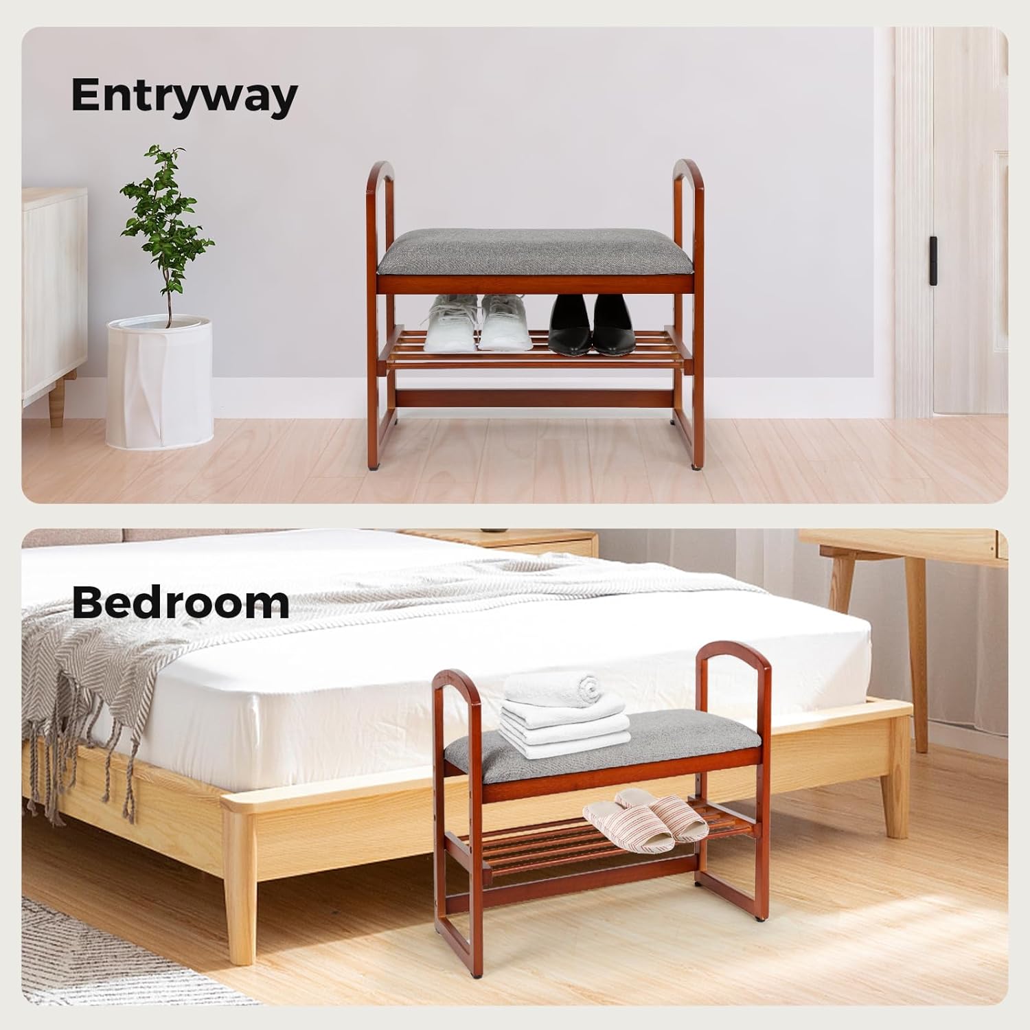 StrongTek Bamboo Shoe Bench, Storage Bench with Armrests & Cushion, Compact Entryway Bench for Seniors, Small Shoe Rack for Living Room, Bedroom, Hallway