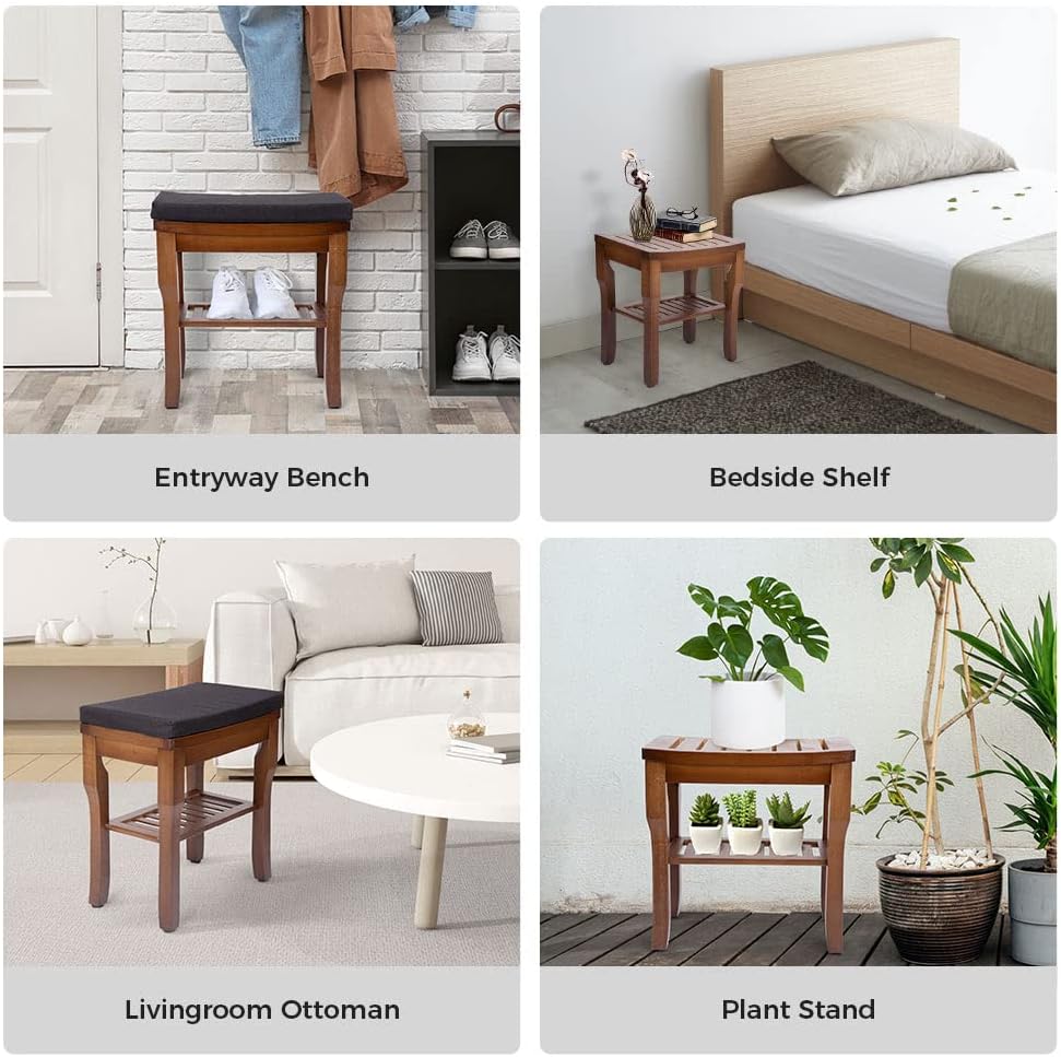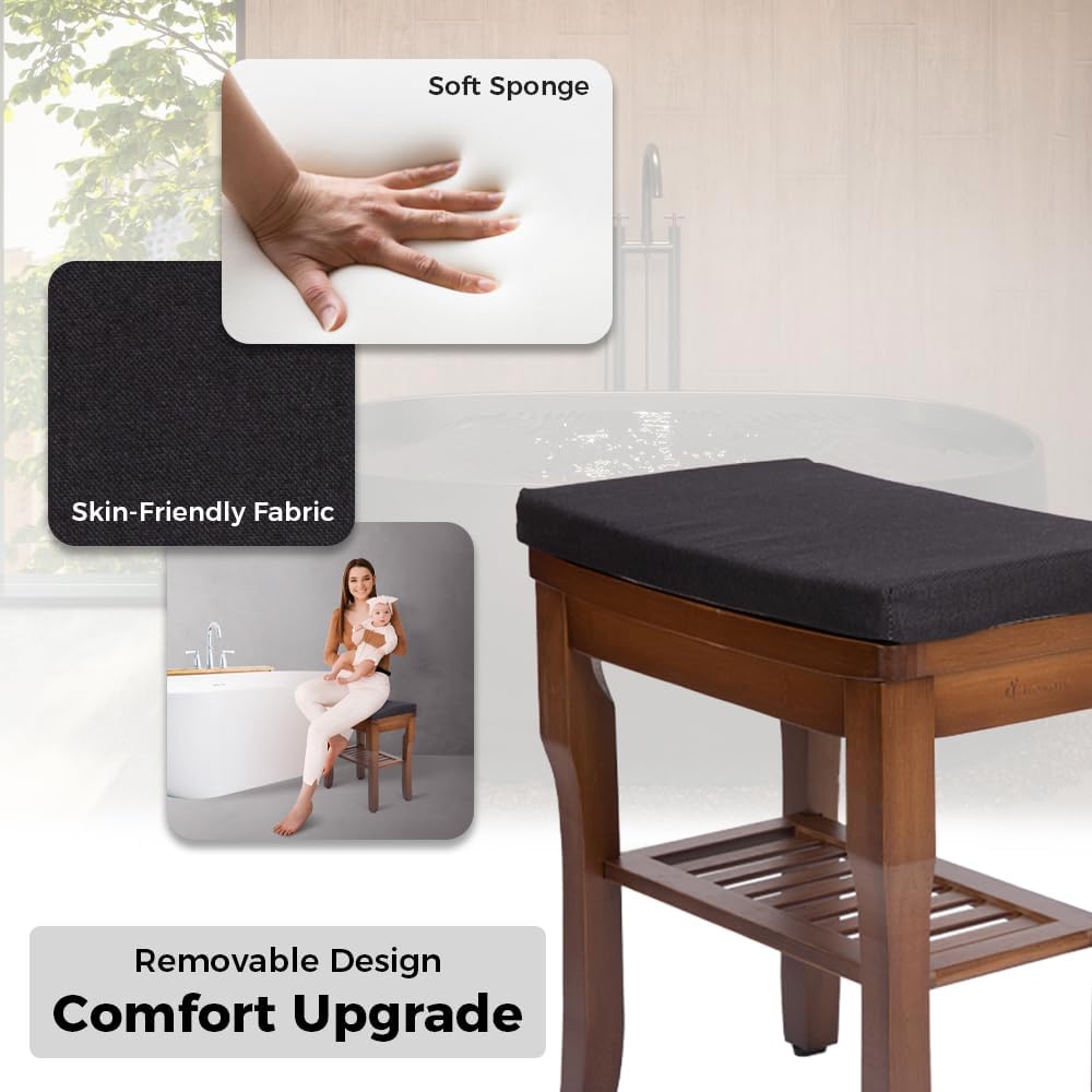Dual-Purpose Comfort: Perfect for both wet and dry environments, this bamboo shower stool comes with a soft cushion for added seating comfort, making it ideal for bathrooms, saunas, and other living spaces.
