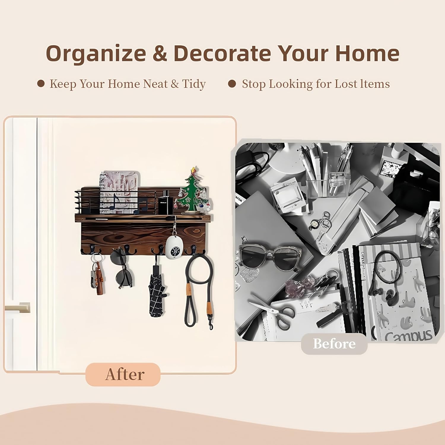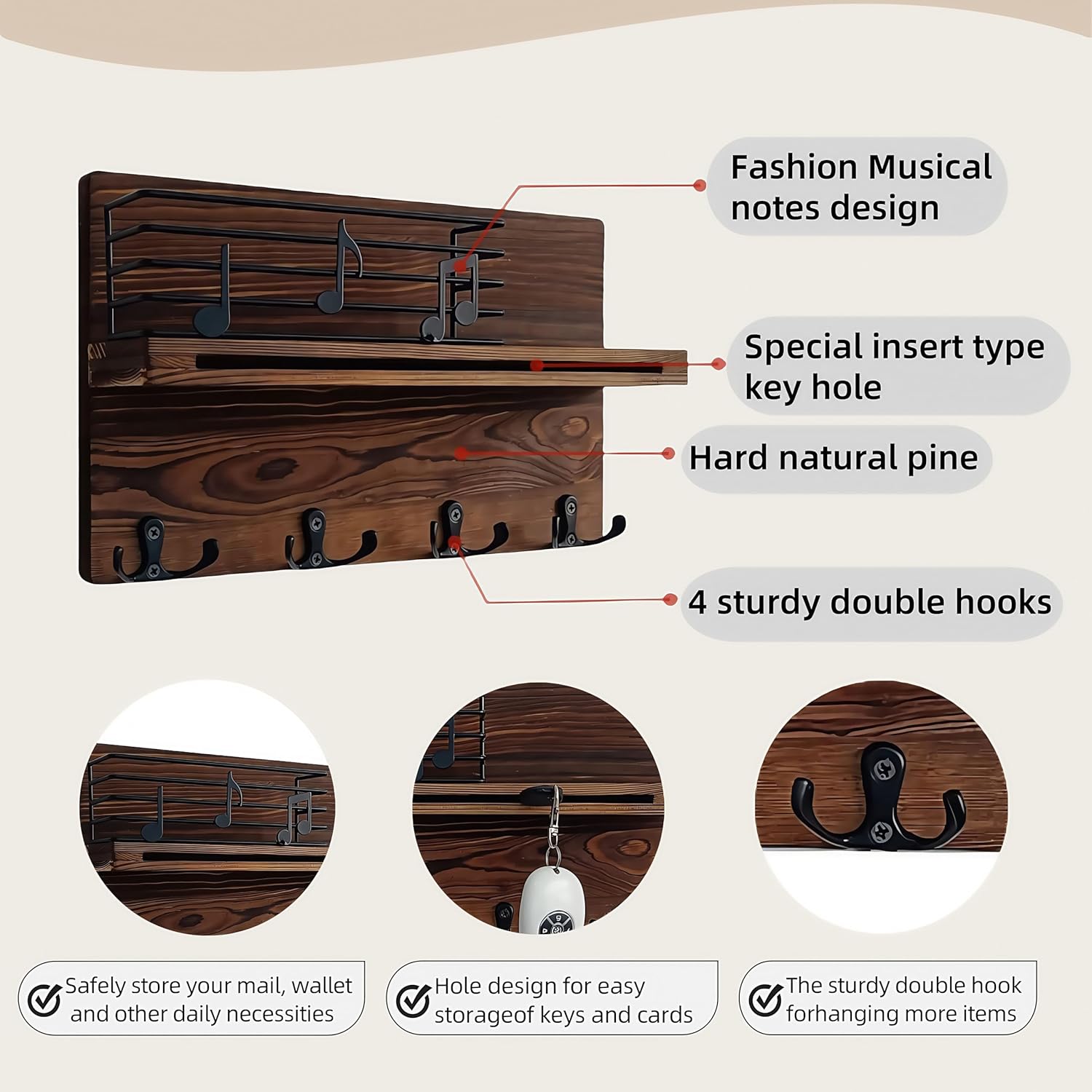 Petite but Powerful Organizer:This space-saving key and mail holder for wall proves big things come in small packages(11.8”W x 7”H x 2.9”D). Engineered with sturdy double hooks that securely hold keys, dog leashes, sunglasses, hats, its apartment-friendly size delivers entryway organization magic without overwhelming your walls. The rustic modern design transitions seamlessly from mudroom storage to living room decor, while hard natural solid wood ensures lasting durability