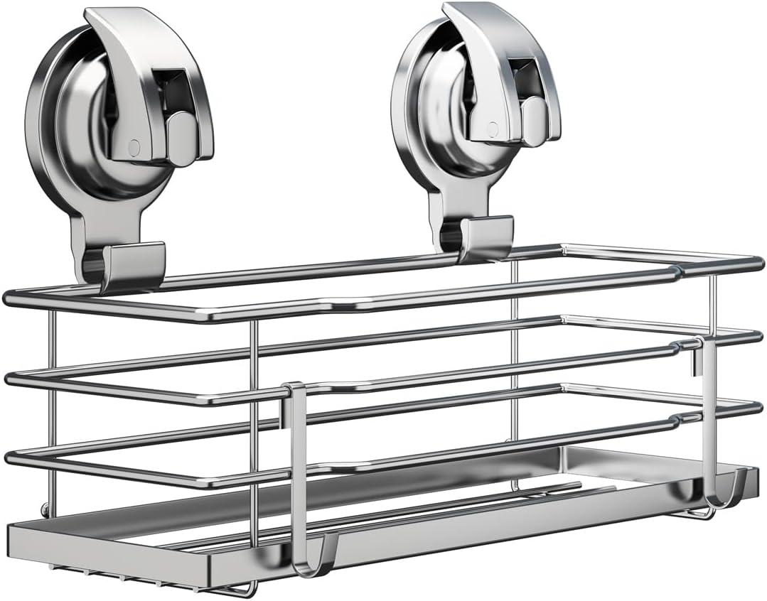 Suction Cup Shower Caddy, Shower Shelf Soap Dish with Hooks for Razor, Sponge, Rust Proof 304 Stainless Steel, Silver
