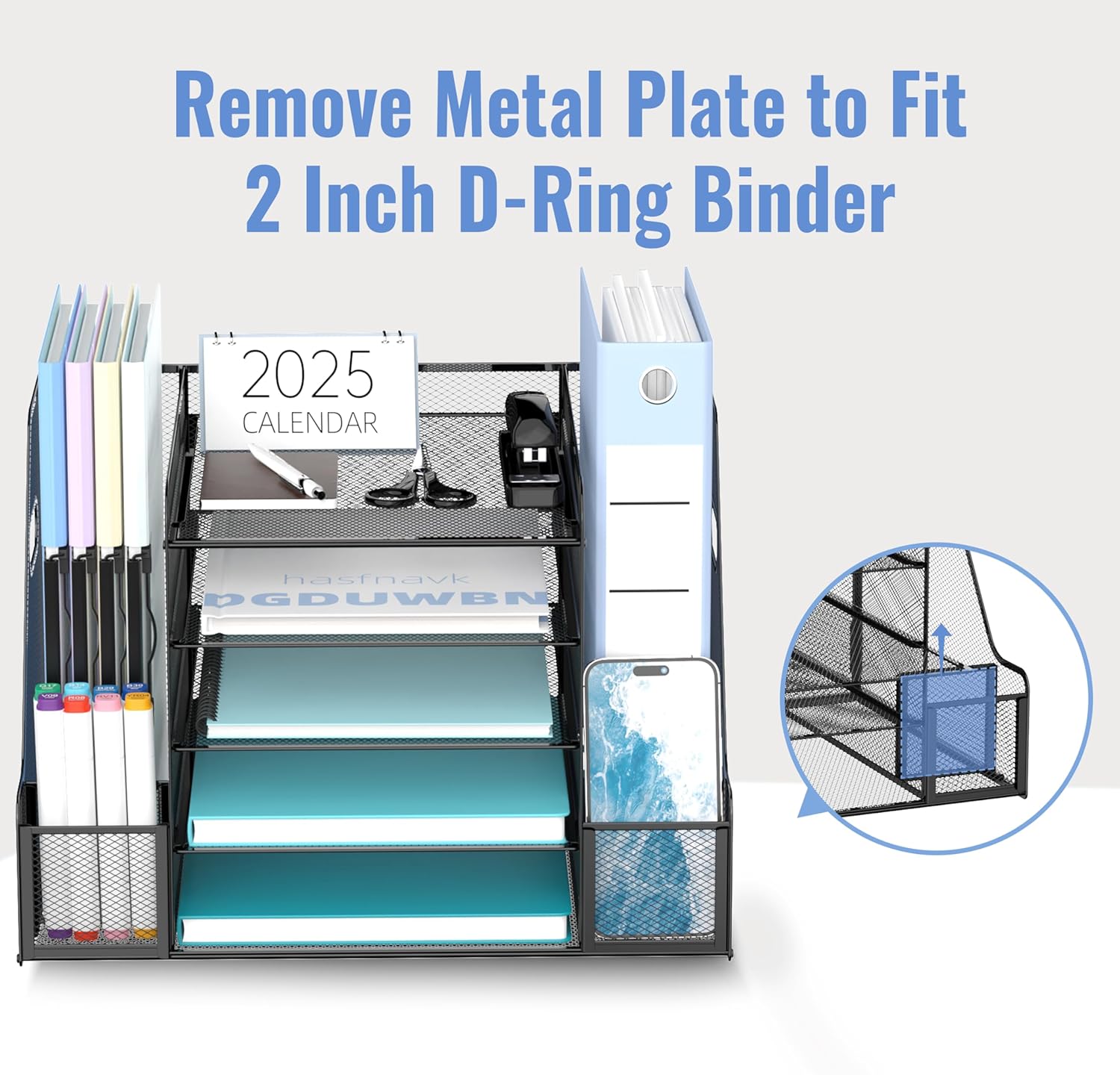 SUPEASY 5-Tier Mesh Desk Organizer with File Holder & Bookends, Metal Paper Letter Tray Organizer with 2 Pen Cups, Large-Capacity Desktop File Sorter for Home Office/School, Black