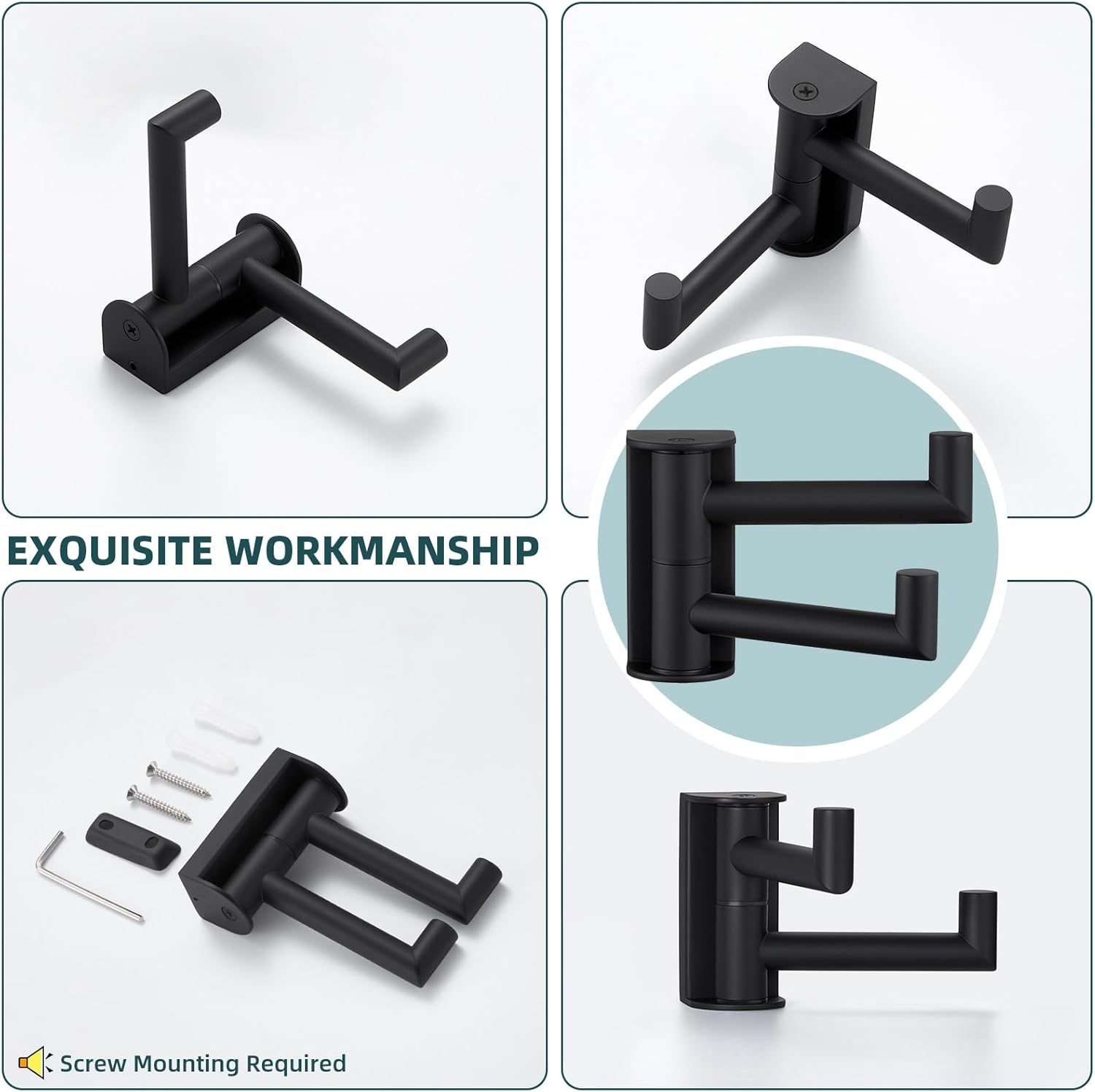 Suyar Matte Black Double Towel Hook, SUS304 Stainless Steel Bathroom Robe Coat Hook with 2 Swivel Arms, Rotating Towel Holder for Kitchen RV Storage, Wall Mounted