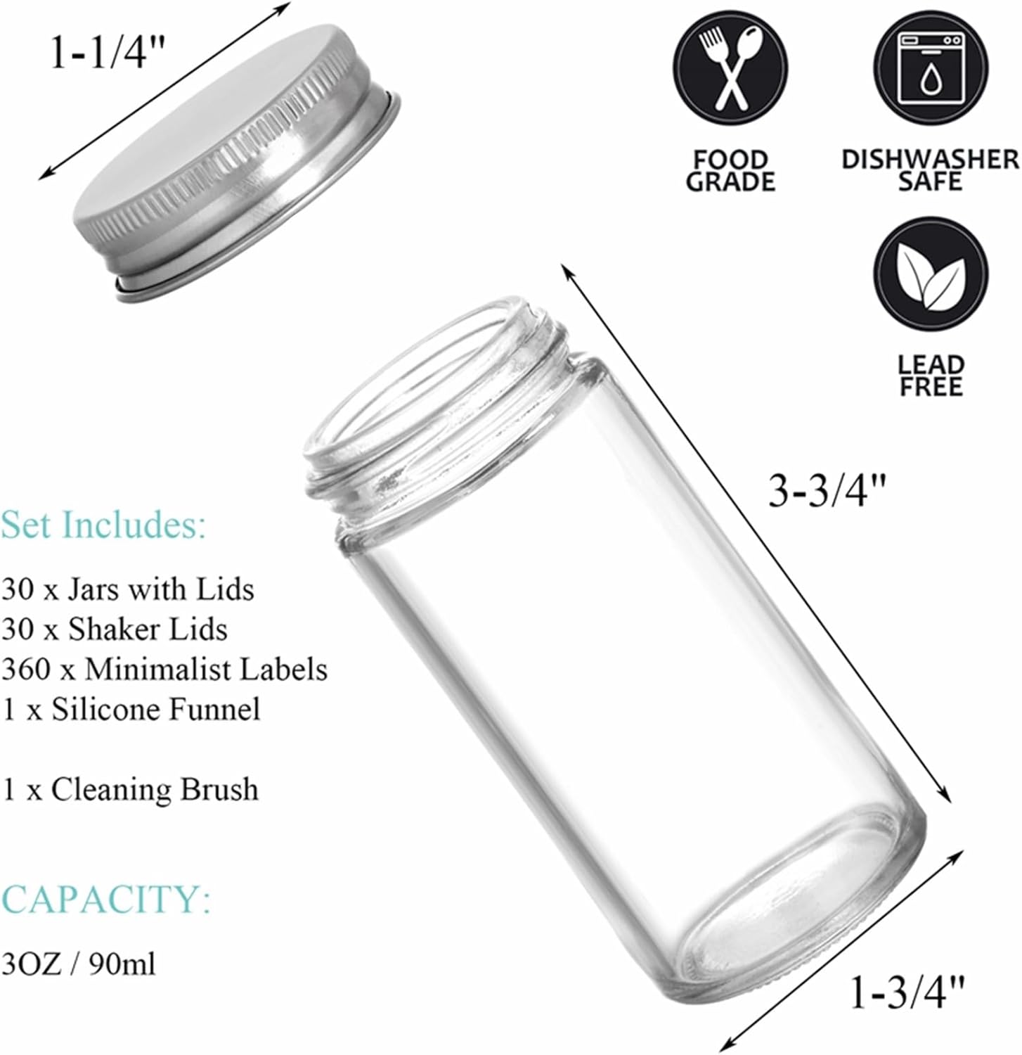 This spice jar set includes 30 glass jars + 30 silver metal lids + 30 shaker lids + 180 Black Pre-printed Labels + 180 White Pre-printed Labels + Green Silicone Funnel + Cleaning Brush, complete spice organizer set for your needs.
