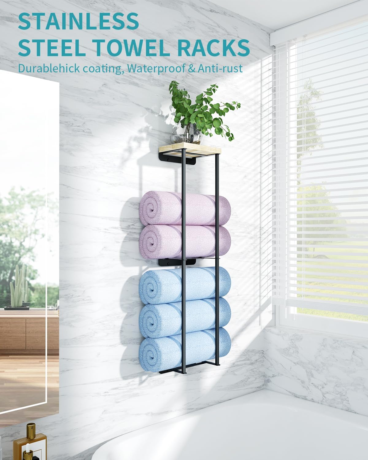 Sturdy and Durable: Our bathroom shelves is mainly made of high quality metal, which is strong and durable, you don’t have to worry about the bathroom towel holder getting bent. The top adds a wooden shelf to greenery or other decorative items, space saving.