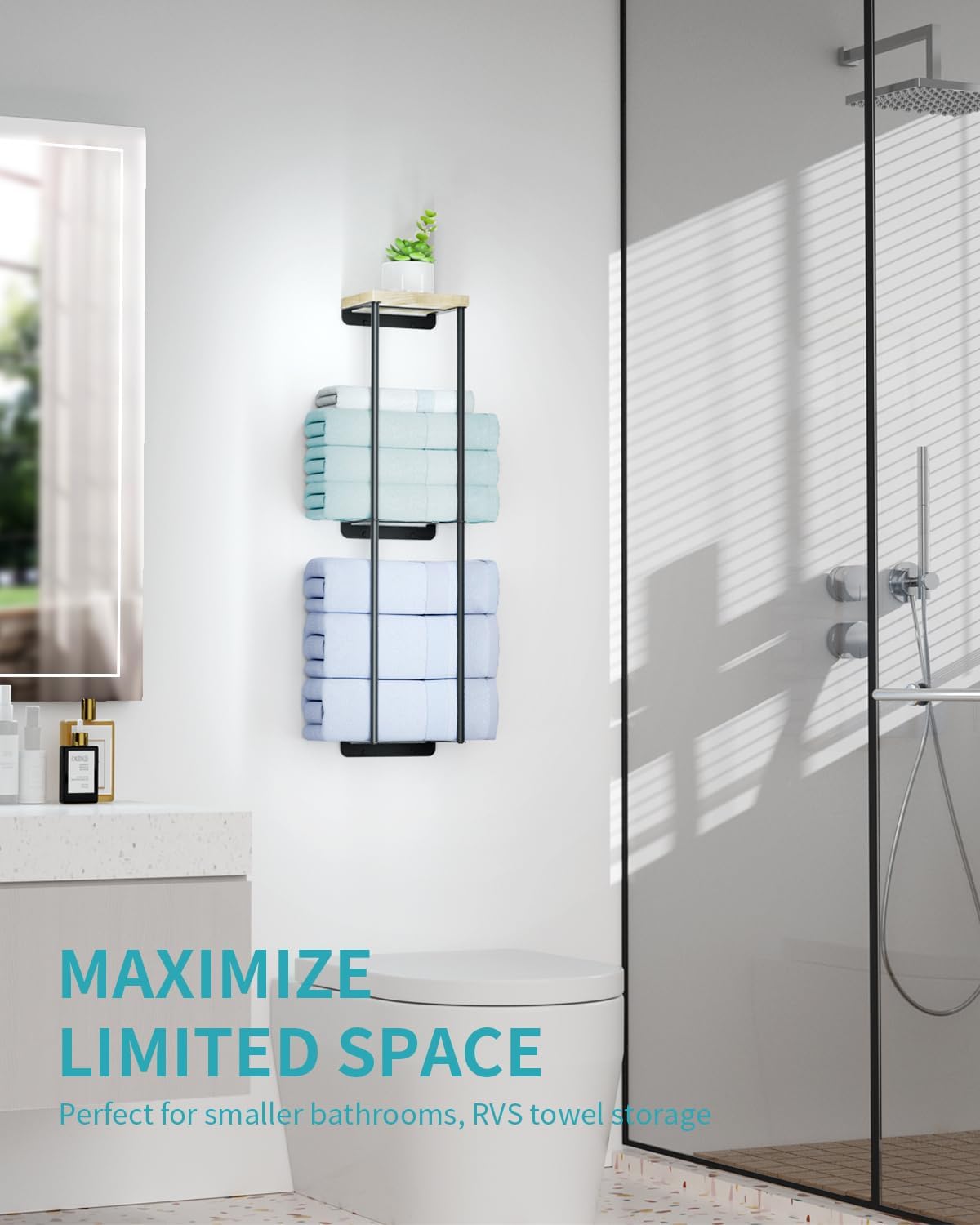 The 2-tier bathroom towel holder maximizes space.