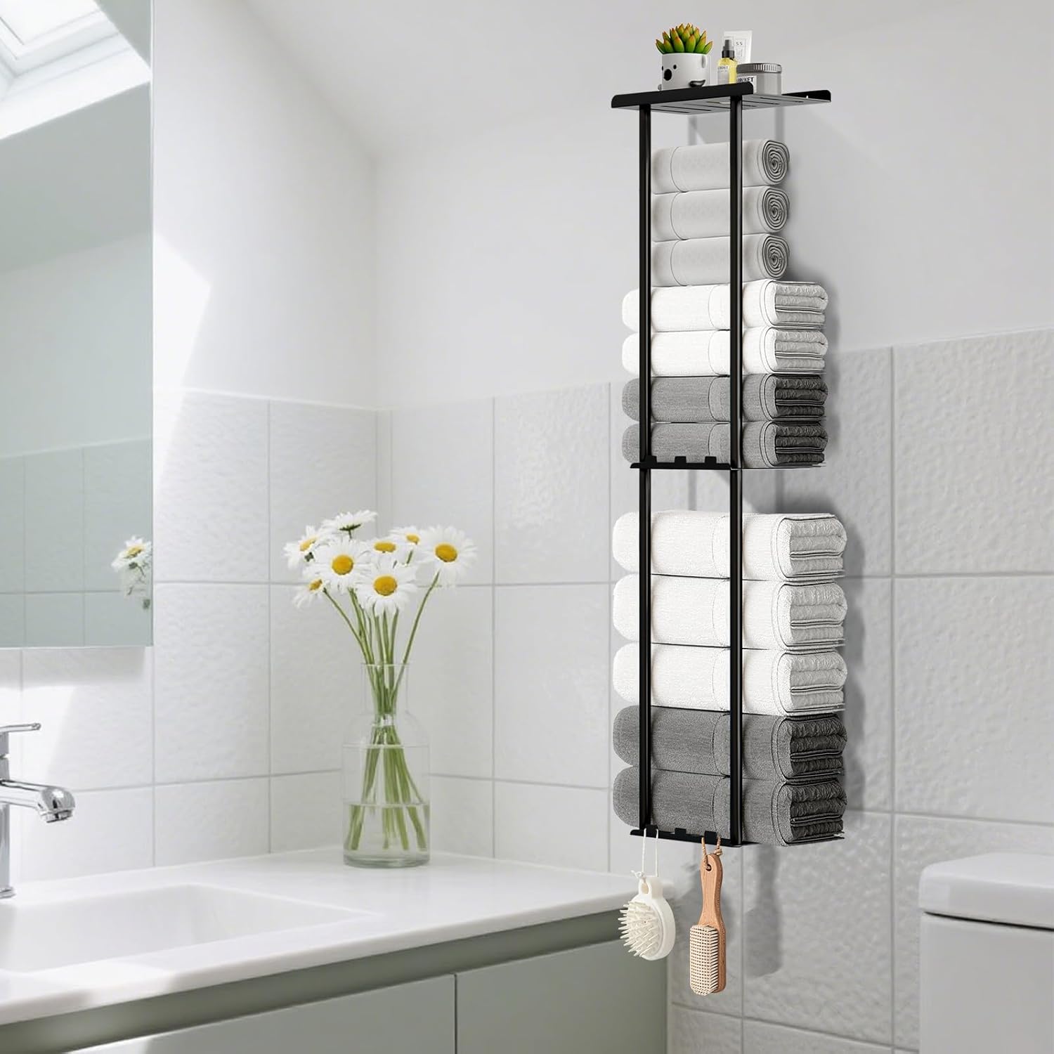 Sturdy Metal Construction & Airflow Design: Made of heavy-duty black metal for long-lasting durability. The open shelf design promotes air circulation, preventing musty odors and keeping towels dry and fresh.