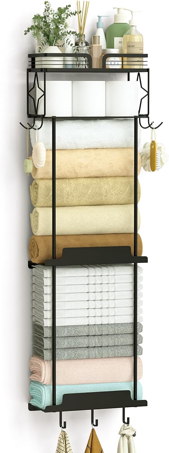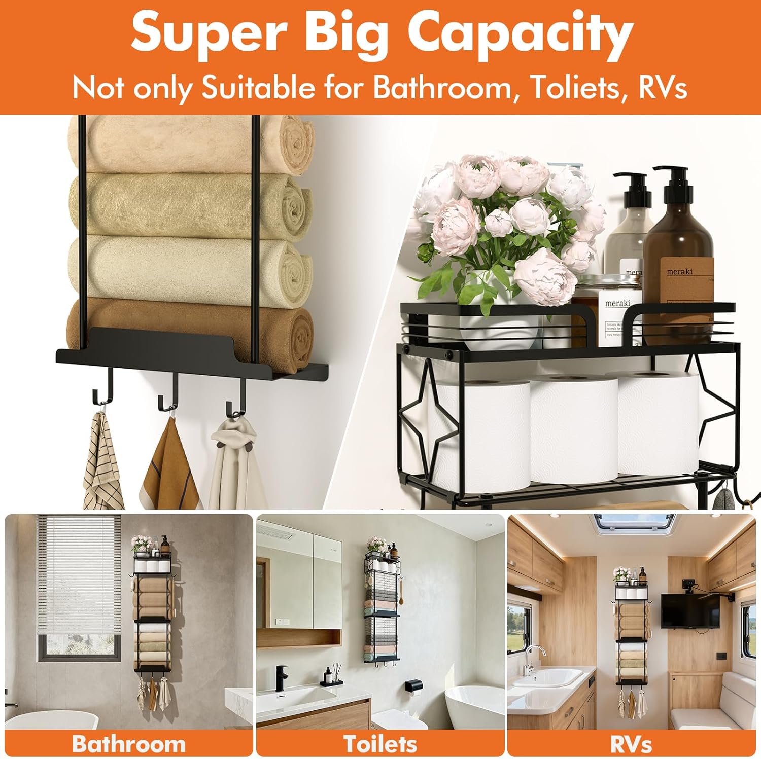 Quick & Easy Installation with Tools Included – Includes all mounting hardware and a clear visual guide for effortless setup. Install this bathroom towel storage rack near the shower, above the toilet, or in any closet within 15 minutes—no drilling expertise needed