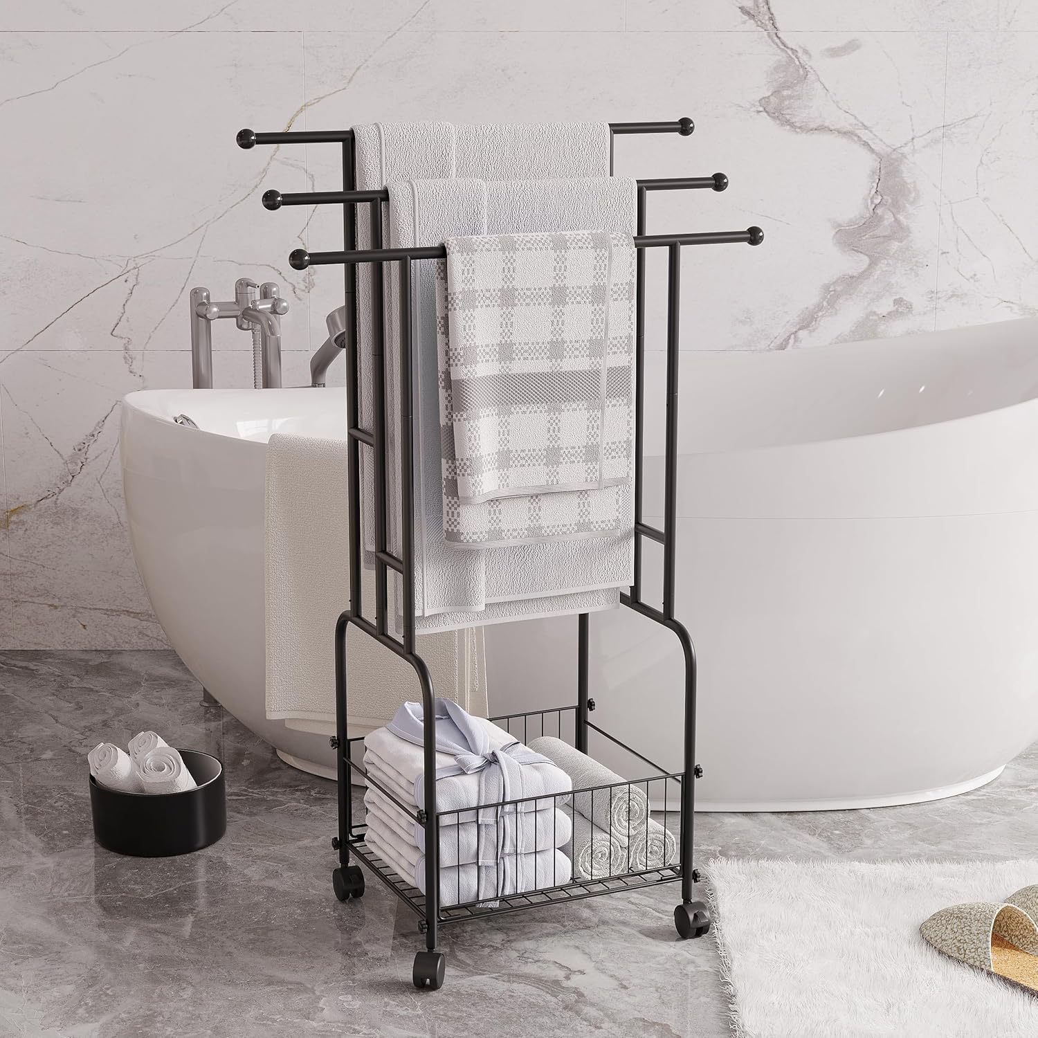 Towel Racks for Bathroom, 42″ H 3-Tier Durable Black Reinforced Alloy Stand with Wheels and Basket, Free Standing Towel Rack, Multi-Use Blanket Rack for Indoor/Outdoor Bathroom Display