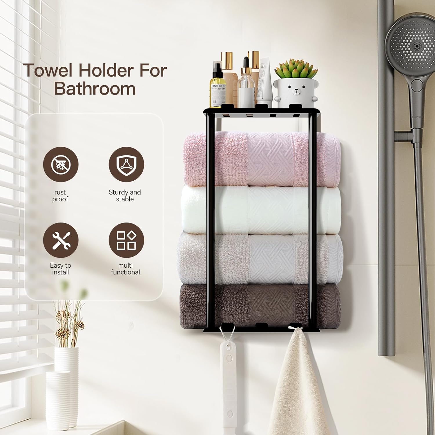Efficient Double-Tier Bathroom Towel Rack with Shelf: This wall-mounted towel rack features a double-tier design with a sturdy metal shelf, perfect for organizing bath towels, hand towels, and washcloths. The top shelf provides extra space for toiletries or decor, making it ideal for small bathrooms, RVs, and apartments