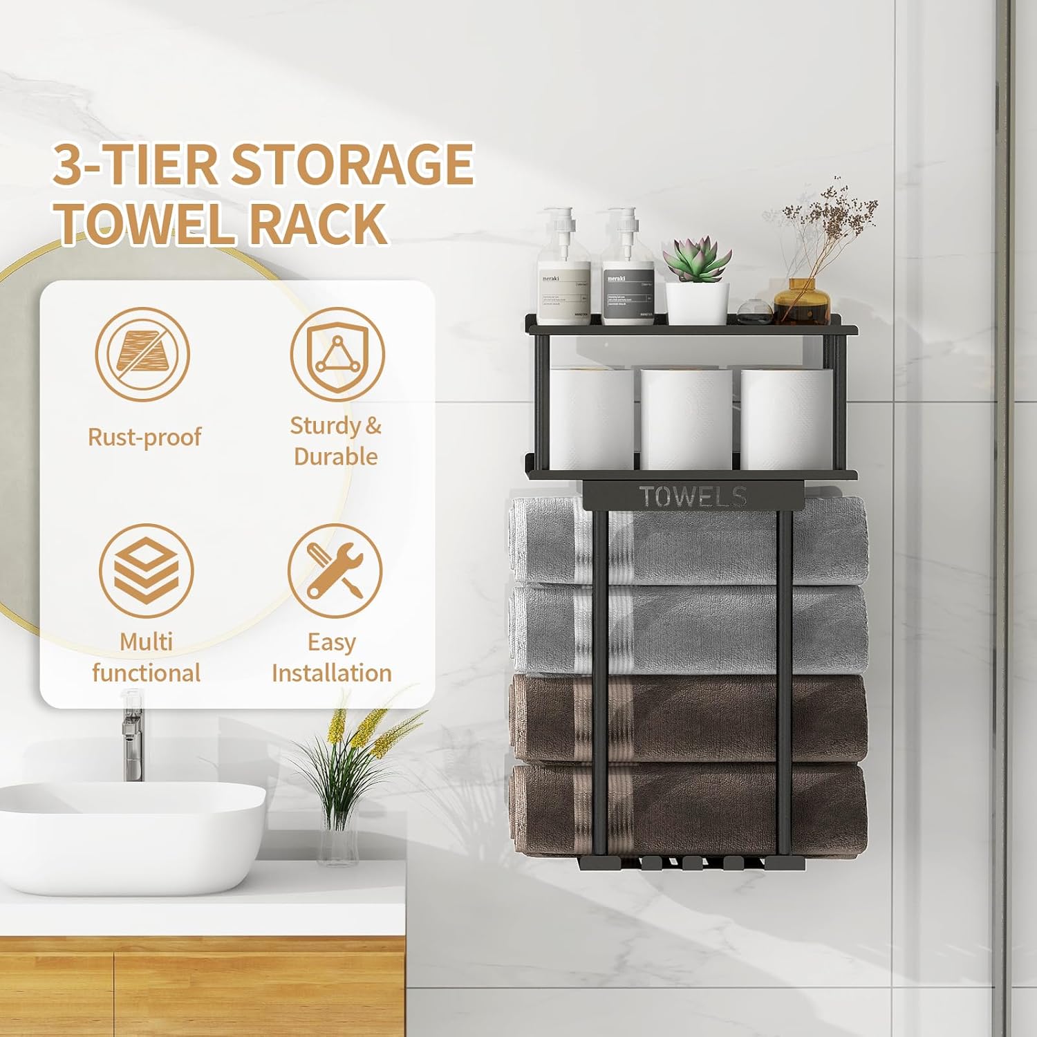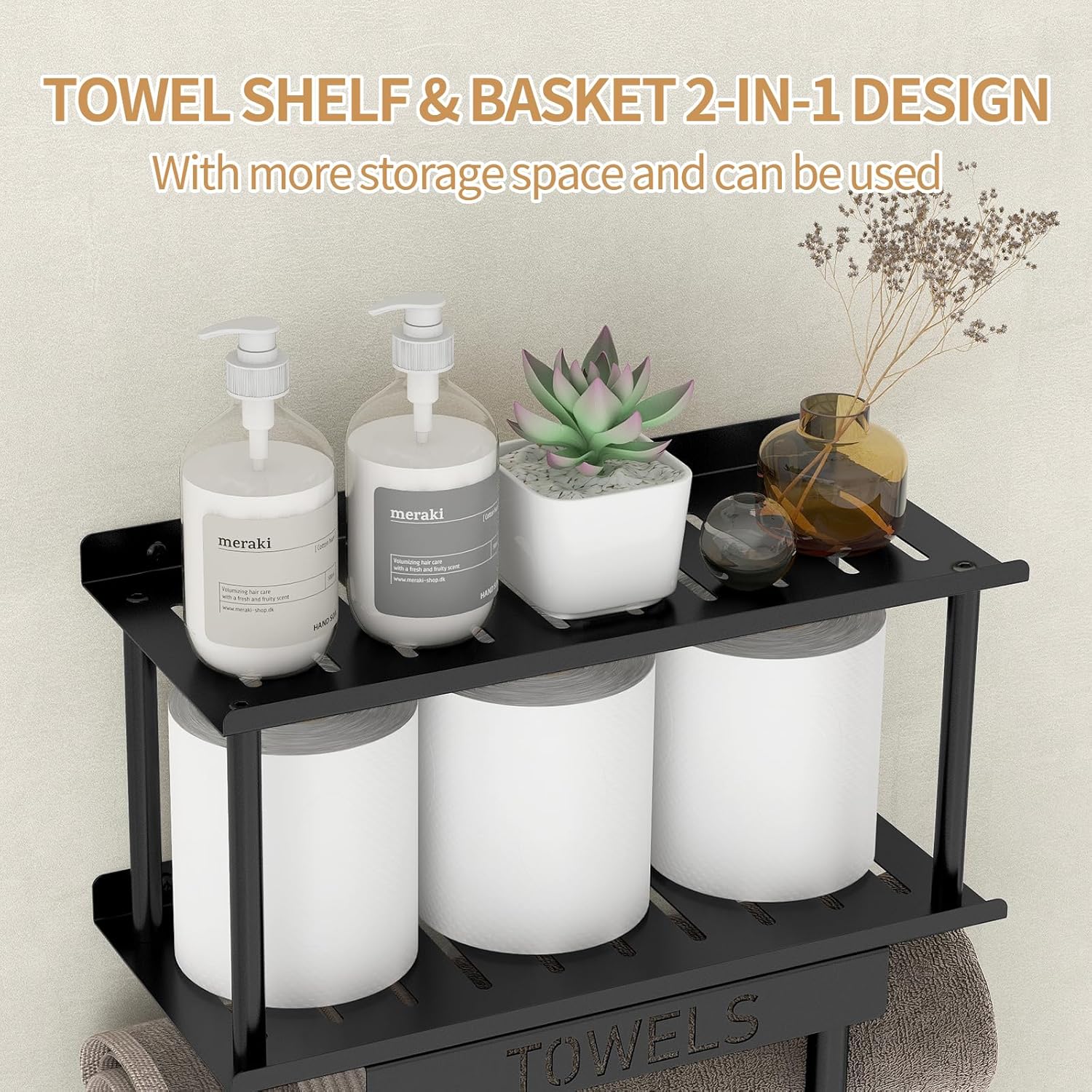 Towel Racks for Bathroom Wall Mounted, Metal Bath Towel Rack for Rolled Towels, Wall Towel Storage Holder with Shelf & Storage Basket, Towel Organizer with Hooks for Small Bathroom – Black