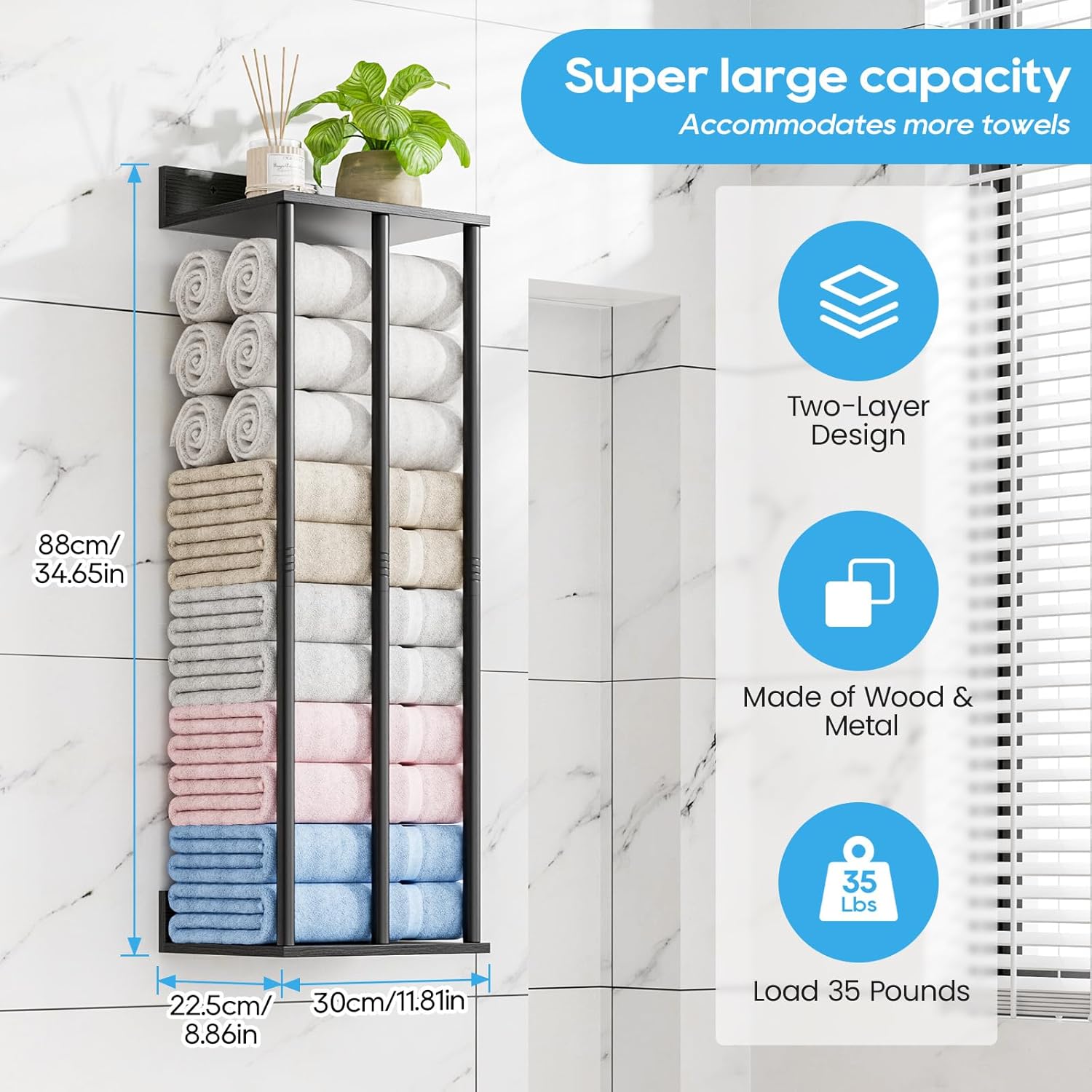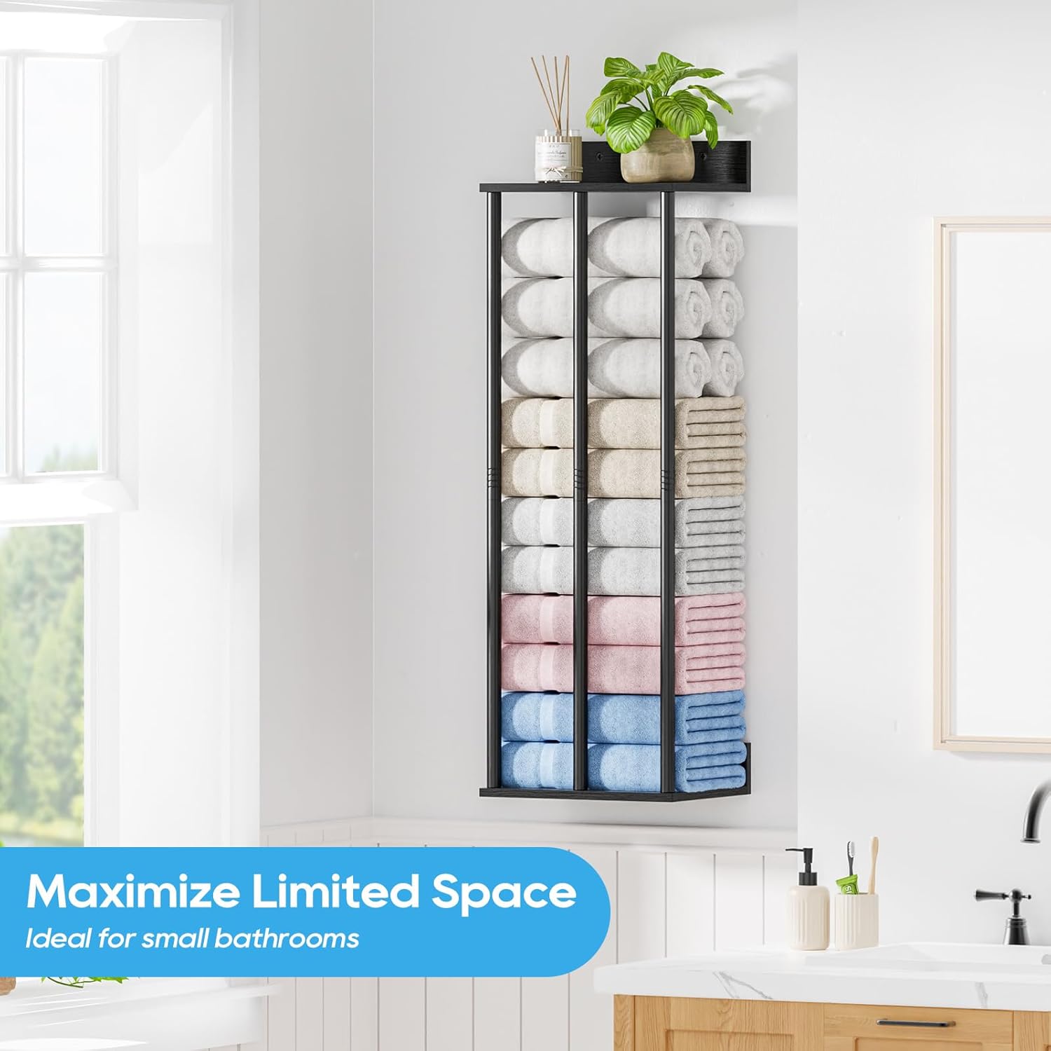 Towel Racks for Bathroom Wall Mounted with Wooden Storage Shelf, Updated 3 Bar Metal Towel Holder for Rolled Towels, Sturdy and Large Capacity, Towel Storage Organizer-Black