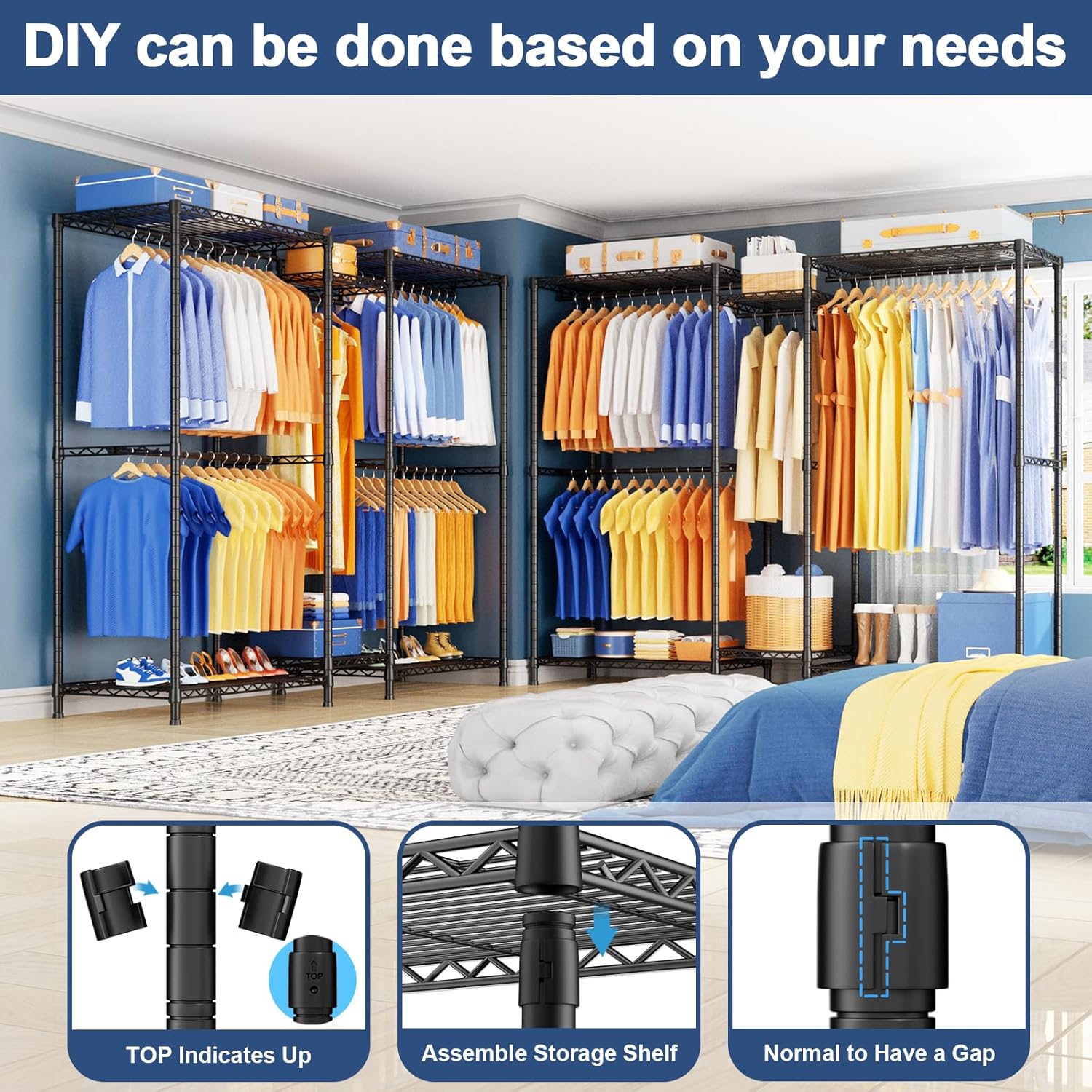 ▶【PORTABLE & MULTI-SCENARIO】Our clothes racks for hanging clothes can be flexibly and freely assembled,You can take portable clothes rack anywhere you need it,Such as bedroom, laundry room, living room, cloakroom, hallway, etc,Coupled with the Anti-tip Device to enhance the stability of the heavy duty clothes rack,You will get a flexible closet organizer and storage system,Can be mobile or fixed!