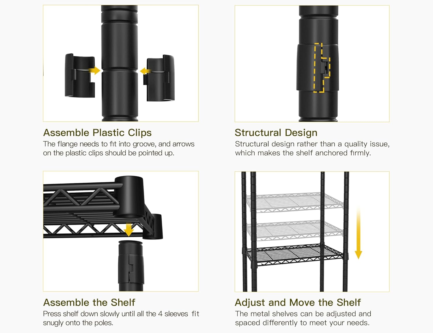 There is a gap between 2 plastic clips when assembled onto the poles. It is a structural design rather than a defect, which aims to bind the shelves firmly on the poles. Plus, the cone design of the shelf angles makes it fit snugly to the poles.