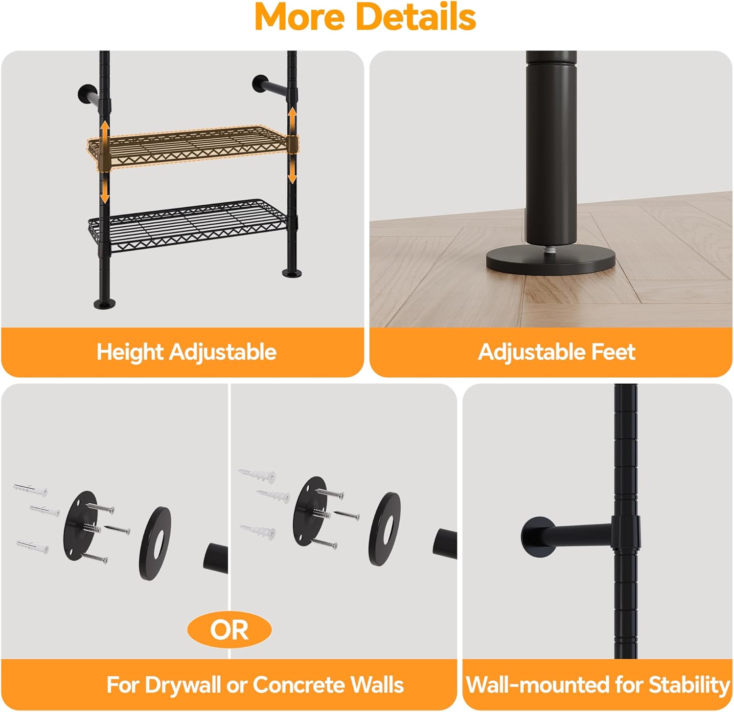 Heavy-Duty Clothes Rack: Built with high-quality matte powder-coated steel pipes and reinforced wire shelves. Scratch-resistant wall mounting holds 1100 lbs. Expandable rods resist sagging even with heavy garments.