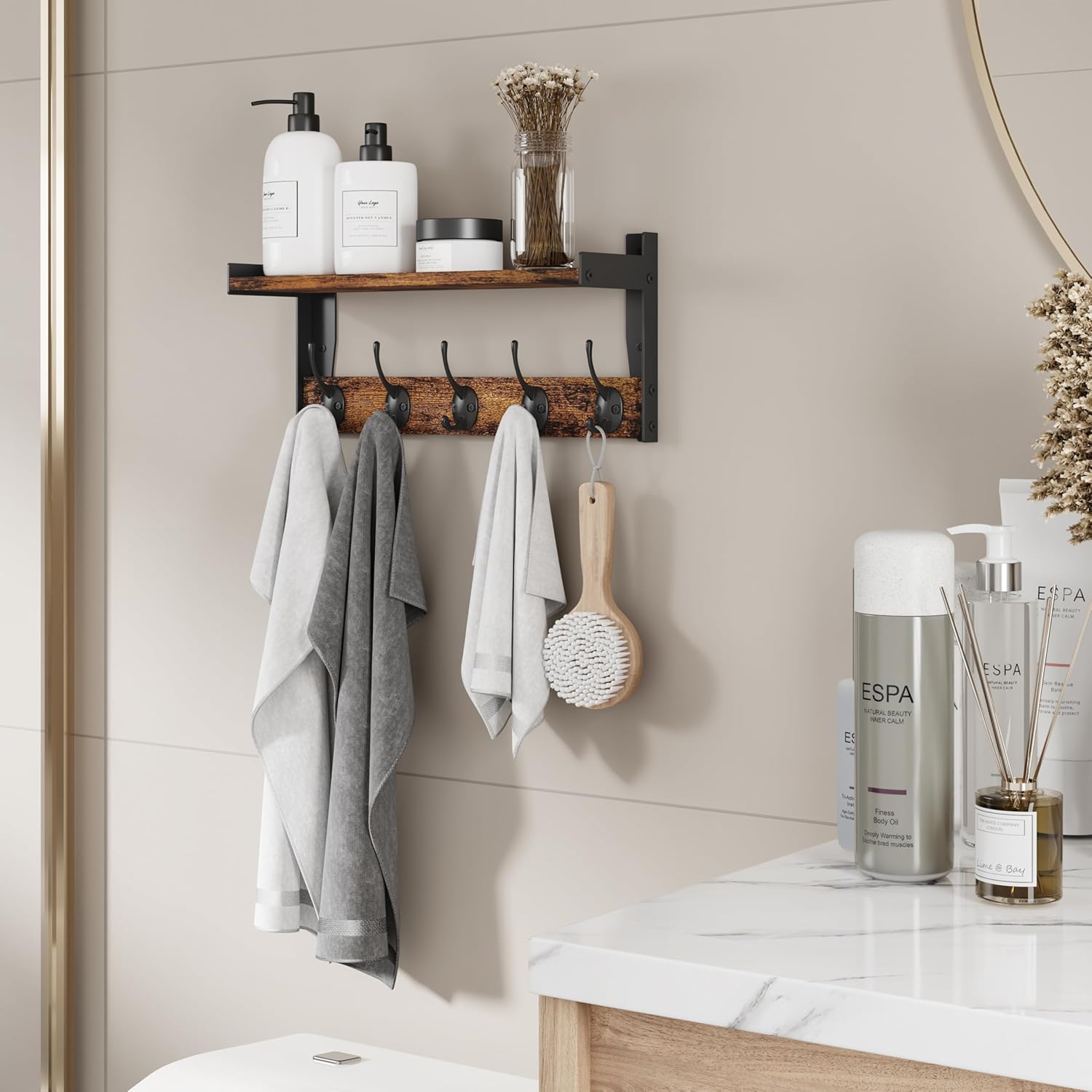 Wall Hooks with Shelf, Wood Coat Rack with Shelf Wall-Mounted, Entryway Hanging Shelves with 5 Metal Hooks for Clothes Hats Towel Purse Robes, Bathroom Mudroom Bedroom, Rustic Brown