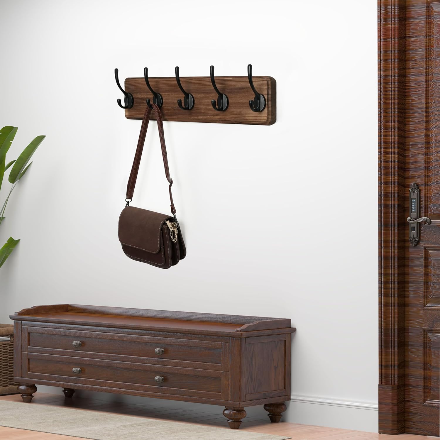 The wall coat rack with 5 hooks for hanging coats,clothes,clothing,hat,towels,jacket,backpack, robe in your entryway,bathrooms,mudroom, etc