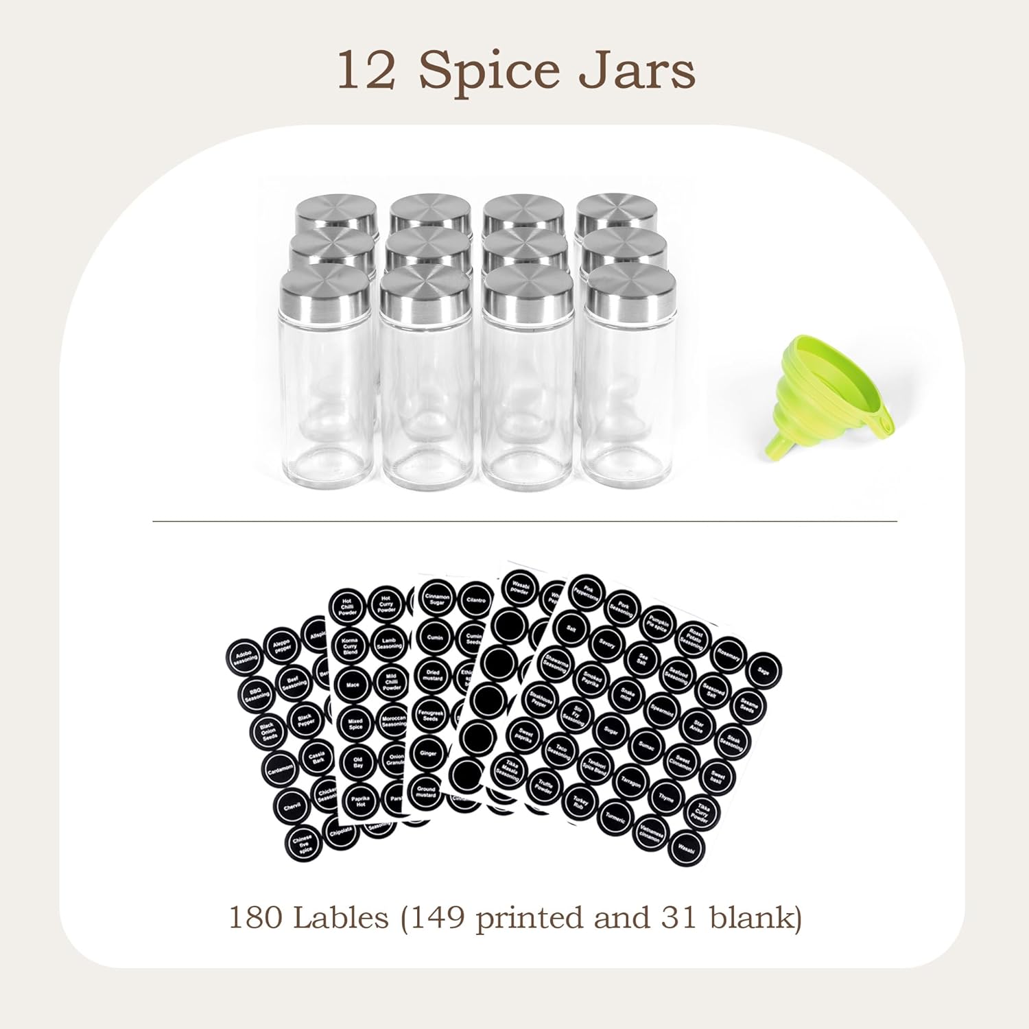 【All-Inclusive Set】Includes 12 airtight glass jars, funnel, 180 lables(149 printed and 31 blank), functional kitchen spice organizer.