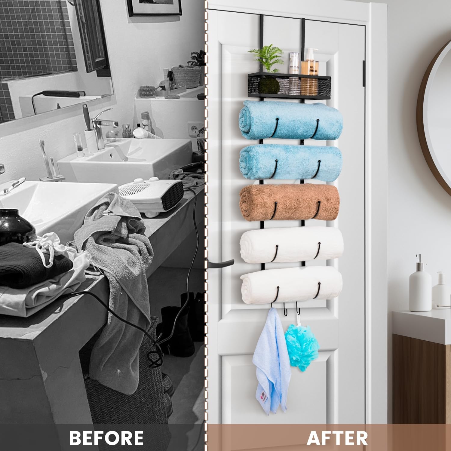 【Multi-Functional Towel Rack】The over the door towel racks for bathroom is divide 5-tier large bathroom towel storage area, and a storage basket on the top, 3 hooks at the bottom. Creating plenty of space for storing and organizing towels and other items. You can store decorations, green plant and aromatherapy on the basket, the hooks suitable for small towels, brushes, bath balls, etc, it is a perfect additional for saving space and decorating in your bathroom