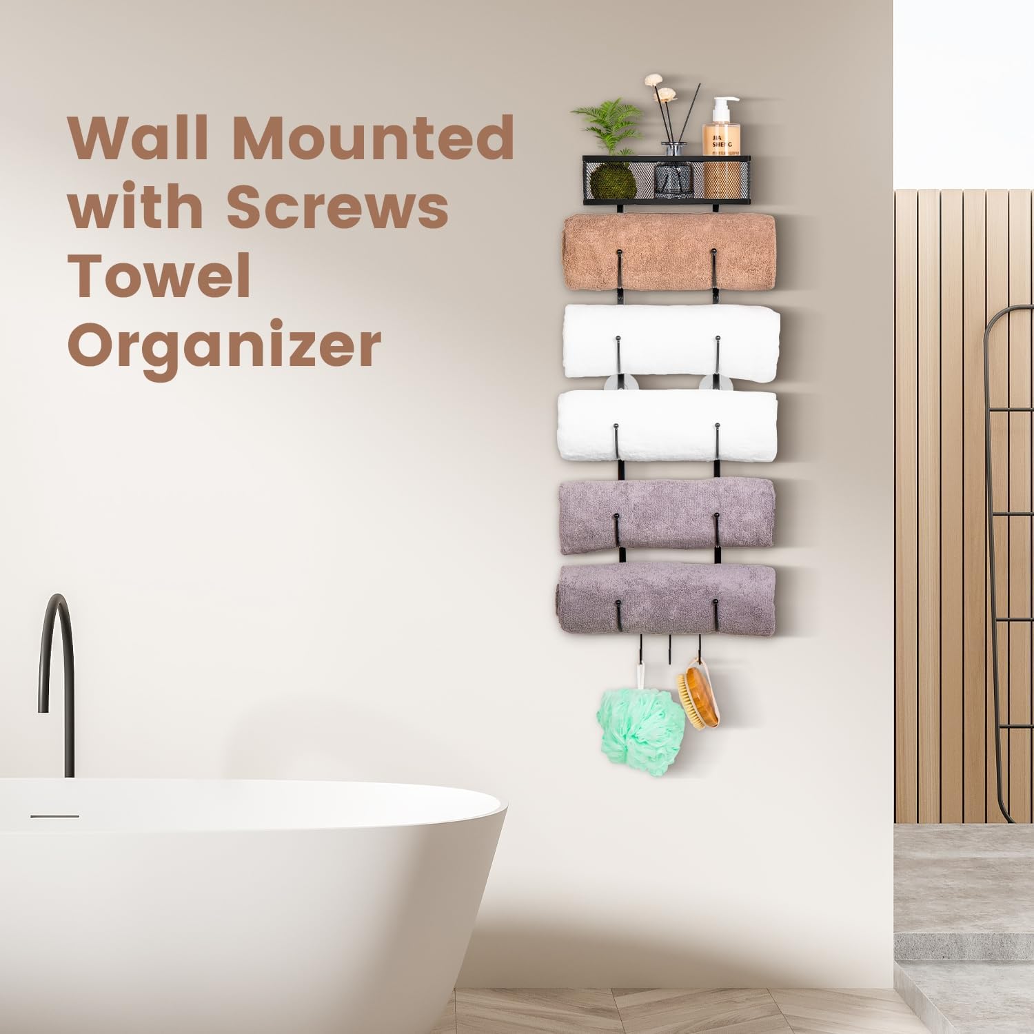 Wetheny 6 Tier Over The Door Towel Racks for Bathroom – Towel Rack Wall Mounted with Metal Basket and 3 Hooks – Rolled Towel Holder Organizer Hanging Towel Storage – Black