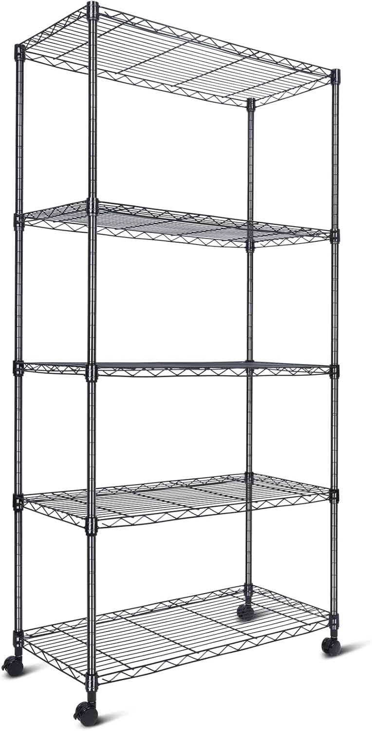 Whitmor 5 Tier Shelving Unit, Adjustable Storage Shelves with Wheels, 400 lbs Capacity per Shelf, Max 2000 lbs Total for Pantry, Kitchen, Garage, 30″ L x 14″ W x 60″ H, Black