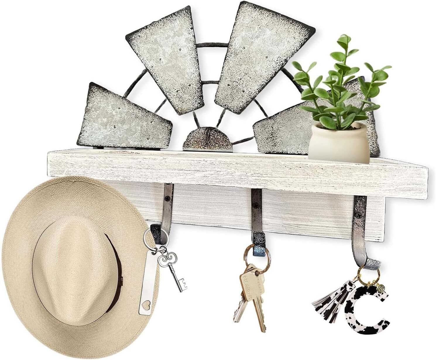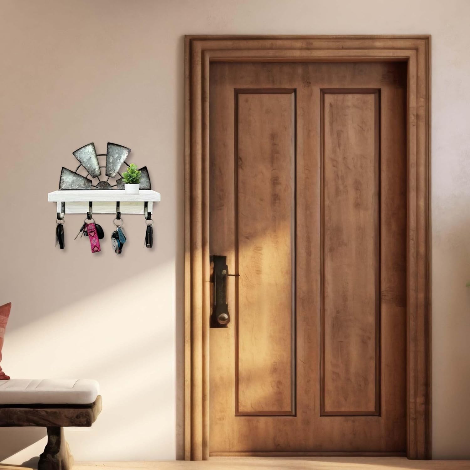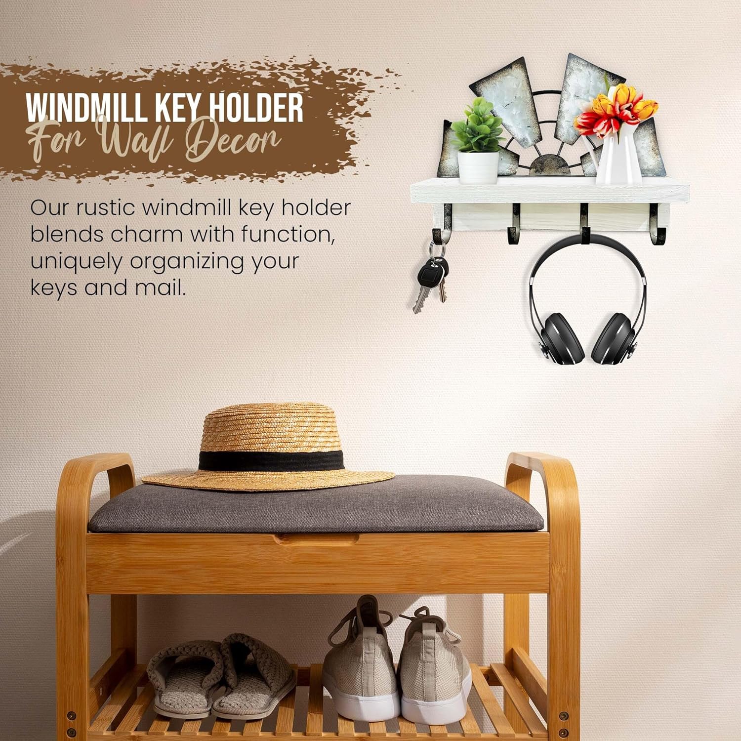 Windmill Key Holder Wall Mount, Decorative Wall Mounted Key and Mail Rack with Shelf, Farmhouse Wall Decor, 4 Rustic Hooks for Coats & Keys, White Western Key Holder.