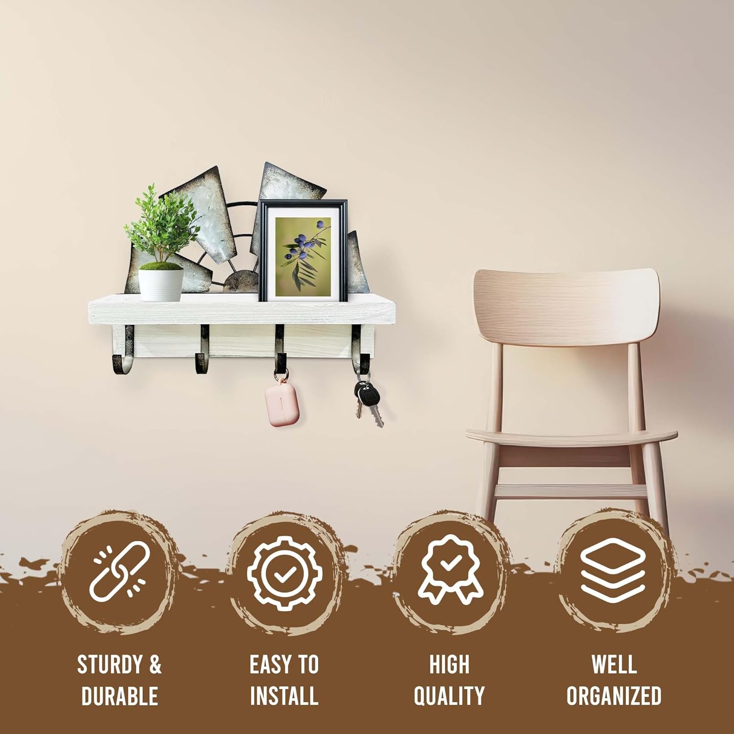 𝗦𝘁𝘂𝗿𝗱𝘆 & 𝗗𝘂𝗿𝗮𝗯𝗹𝗲: Crafted from high-quality white brushed wood, our 11.8” x 3.4” key and mail holder for wall features durable prong hooks and sturdy blade material. This wall shelf with hooks ensures your home is a clutter-free and organized space. It is a perfect key organizer wall mount.