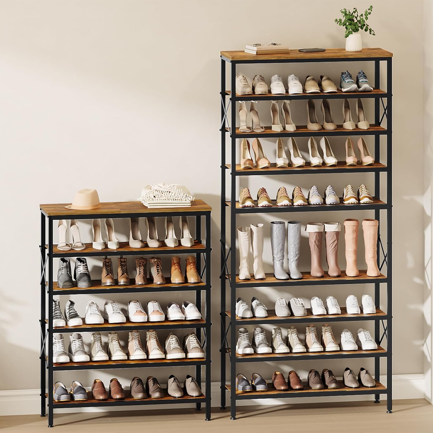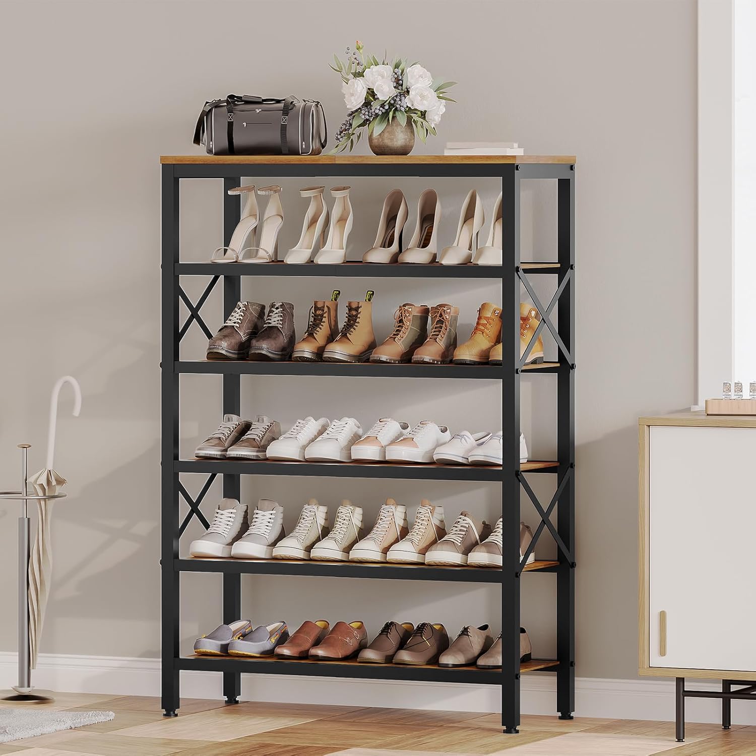 Industrial Style Design: This 6 tier shoe rack combines retro wooden-grain shelves with sleek black metal frames for a distinct look. The wooden shoe rack blends effortlessly into industrial, vintage, and many other home decor styles, adding unique texture and personality